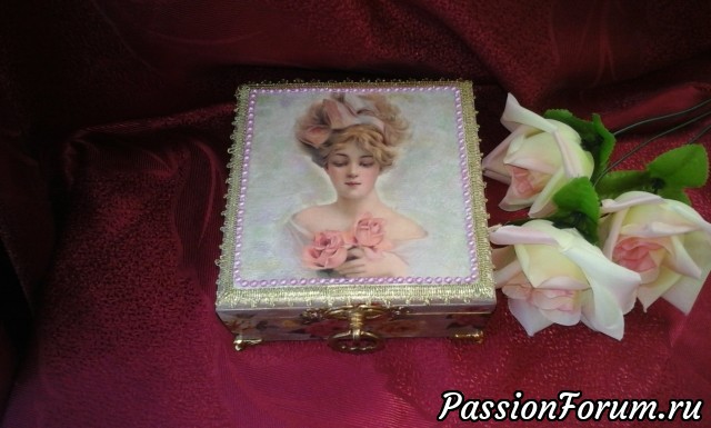 А насчет тоненьких стенок шкатулок — никакой особой техники тут нет. Просто после покраски и после лакировки много-много раз закрываю шкатулку и открываю. Стеночки и крышка " привыкают", что должны обязательно закрываться и не привередничать. А если серьезно, то всегда боюсь, что не закроются и стараюсь обойтись небольшими слоями краски и лака.