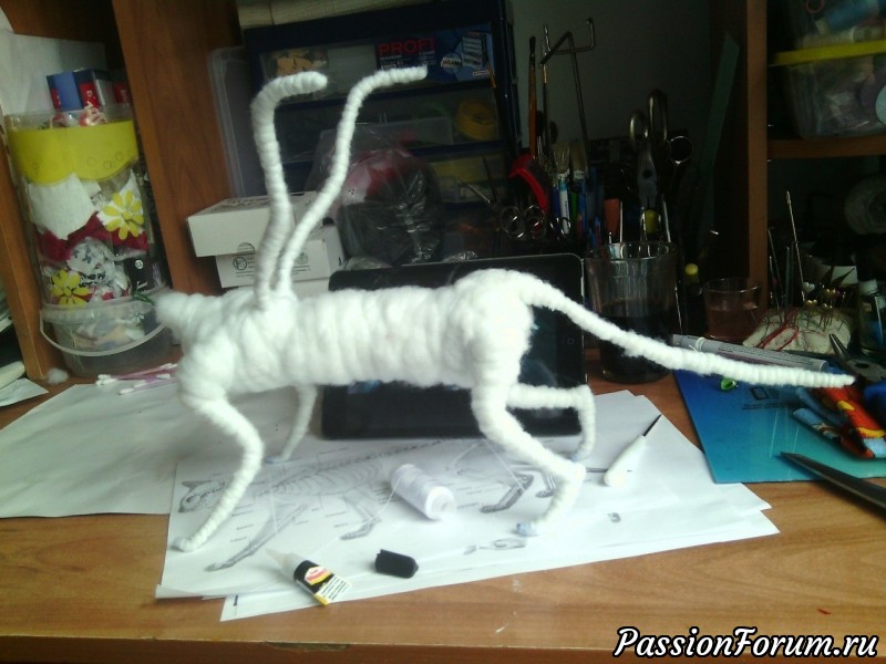 У меня на изготовление необычного заказа было всего 5 дней. В короткий срок нужно было продумать от и до. Огромное спасибо за помощь моему колу Лео, который очень сильно мне помогал в создании крылатого собрата. А началось всё с правильной анатомии - прочный каркас, изолента и утяжеление задней части туловища, чтобы голова будущего зверя не превешивала.