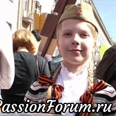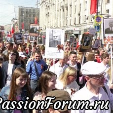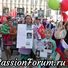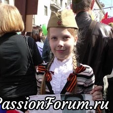 У моей младшей племянницы 9-летней Леночки был флаг РОССИЯ, потом мы ей купили пилотку. У нас в руках - наши плакаты, флажки 9 МАЯ, шарики... Брали с собой 4 литра воды (на 5 человек), пластиковые стаканчики, хлеб и бутерброды. За 3 часа шествия, почти всю воду выпили. Мы не видели, чтобы кроме воды люди вокруг нас пили пиво, вино... Даже не курили. Радостные, светлые, доброжелательные лица. Чувствовалось какое-то единение и необыкновенный подъем... Мы очень рады, что не остались сидеть дома у телевизоров.