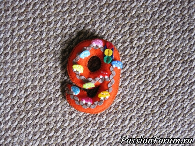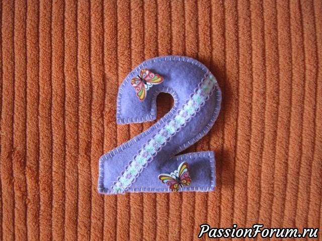 Размер цифры примерно 12*5 см. Фетр взяла мягкий, толщиной 1 мм. Для знаков взяла жёсткий фетр 2 мм. Фигурные пуговки ещё давно заказала на Али-экспрессе, вот дождались своего часа.
