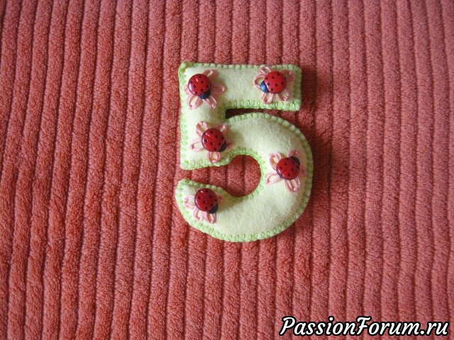 На каждой цифре пуговки по счёту. Для лицевой стороны цифры фетр укрепляла дублерином. Затем декорировала, пришивала пуговки.