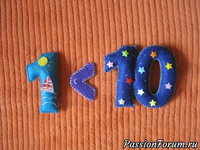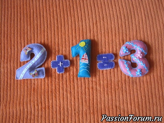 Ни для кого не секрет, что сейчас детки ну ооочень развитые. С пелёнок памперсов мамочки учат своих чад счёту и чтению. Не обошла эта участь и мою внучку Маюшу. В детском развивающем клубе они учат цифры, простой счёт, сравнение. Вот я и решила сотворить для Майи цифры, что бы интереснее было ей учиться. К дню рождения (целых три годика уже исполнилось!) пошились вот такие цифры из фетра: