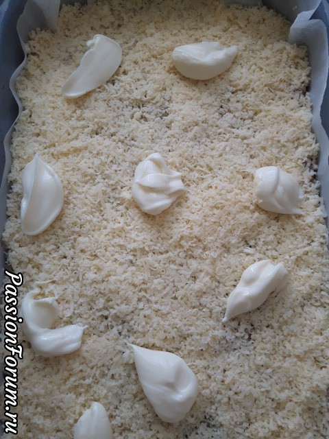 Равномерно раскладываю фарш в посуде для запекания. На мелкой тёрке натираю упаковочку копчёного сыра, распределяю его поверх фарша. Слегка придавливаю. Добавляю майонез "на глаз", так, чтобы он потом покрыл полностью поверхность сыра. Ещё раз разравниваю, придавливая. Далее добавляю немного молотой сладкой паприки. Усё! Запекаю 30 минут в духовке, на среднем огне.