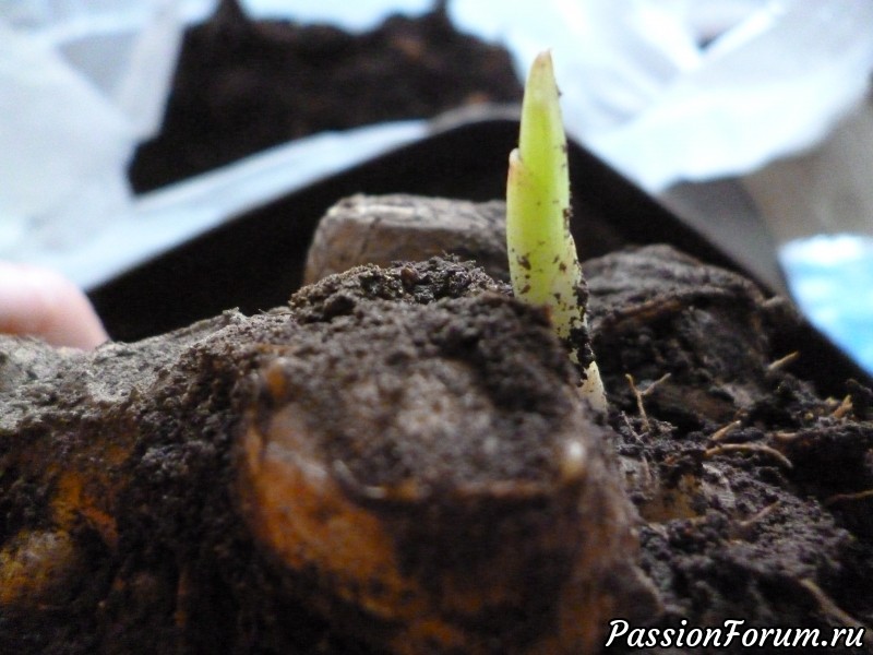 Вытряхнула содержимое горшка в полиэтиленовый пакет, раскопала корни... корешки, величиною с грецкий орех, но уже с толстыми новыми корнями. Увидела зеленый клювик величиной в 1,5 см и еще и зеленую точку на еще одном корешке. Сначала думала, вытряхну все и пущу свой урожай в холодильник, но вот как выкинуть росточки? Снова сунула в горшок