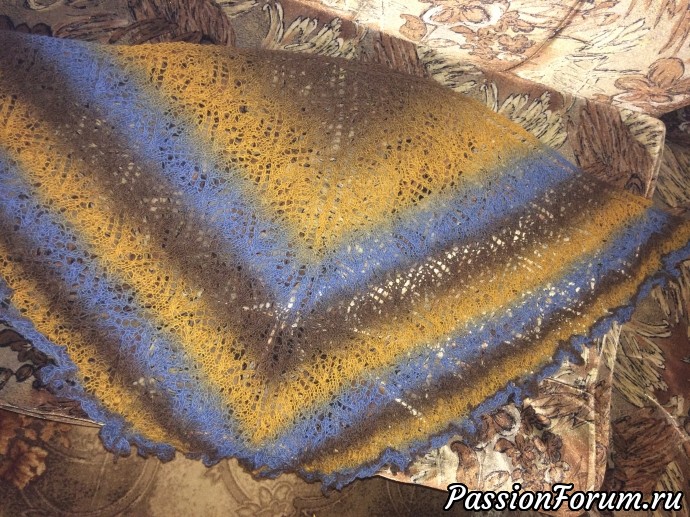 Закончила ещё одну шаль. Теперь"Осенний букет". Связалась очень быстро (по моим меркам), всего за неделю. Нитки использовала Кауни 8/1 Brown-blue, спицы 4, крючок для закрытия петель 4. Как показало "контрольное взвешивание", ушло 102 гр. В оригинале надо было с бисером вязать, но я решила пока без него. Хочу следующую связать уже с бисером, но однотонную. Теперь покажу мою работу. В некоторых местах у каймы не "дотянулись иголочки" - булавки повернулись в обратную сторону. Ну вот ,пожалуй, всё рассказала. Спасибо, что заглянули.
