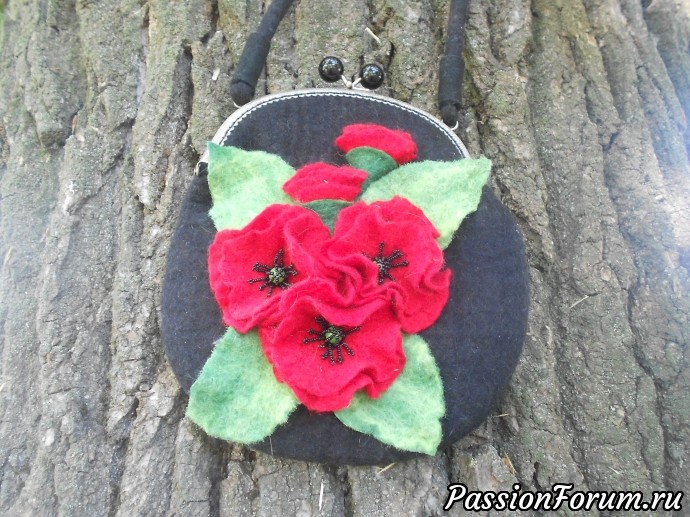 Доброго дня. Долго я вынашивала идею этой сумочки. По задумке декор должен был быть совершенно другим, но как-то так сложилось, что захотелось мне маков! Долго делала, особенно с ручкой возилась) А особенно подвела меня черная шерстка от Айшат- очень много в ней ости оказалось. Все руки были в ней и полотенца пока валяла(