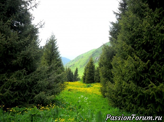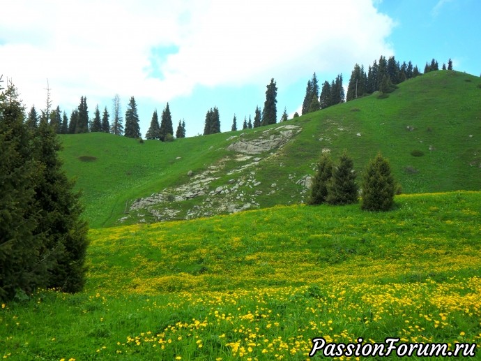 На склоне много лютиков и замечательные стройные ели.Хочется побыстрее забраться на гору и отдышаться.
