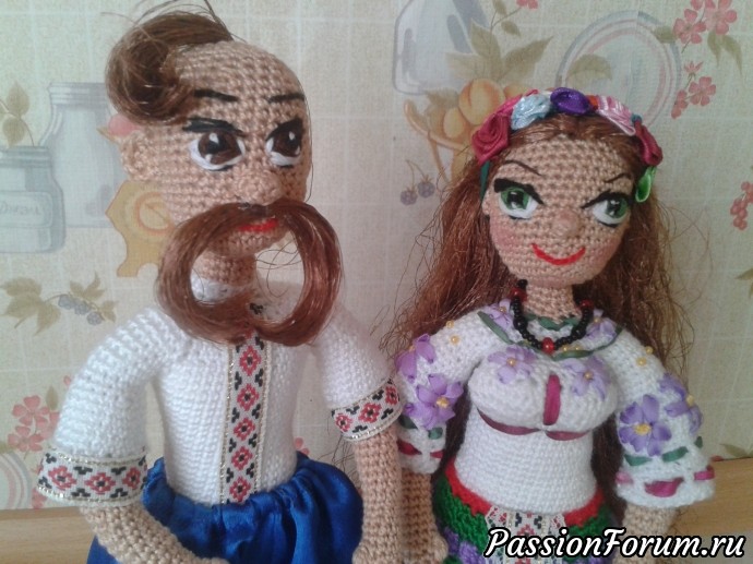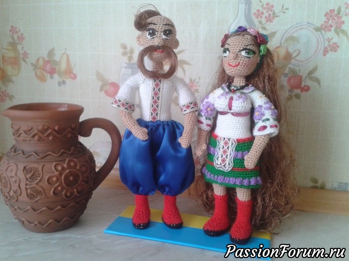 Моя очередная работа "Куклы в украинских костюмах". Возможно кто-то скажет, что я повторяюсь, это моя юбилейная, 10 работа в стиле "Украинский сувенир". Я совершенствуюсь, изучаю и использую в своих работах новые для меня техники в изготовлении игрушек. Ни одна моя работа не повторяется. Каждый раз появляются новые элементы. У этих кукол я сделала вышитые глазки и волосы из атласной ленты. Шаровары у казака тоже сшиты из атласной ленты. Блузка у казачки вышита атласными лентами. Высота кукол 18-20 см, полностью проволочный каркас, самостоятельно стоят. Я поставила их на подставку, т.к. этому сувениру предстоит долгая дорога в Швейцарию в качестве подарка. Очень надеюсь, что там мой подарок понравится. К сожалению фотографии не передают всю тонкость работы, яркость цвета и украинский колорит.