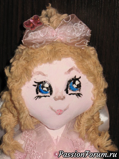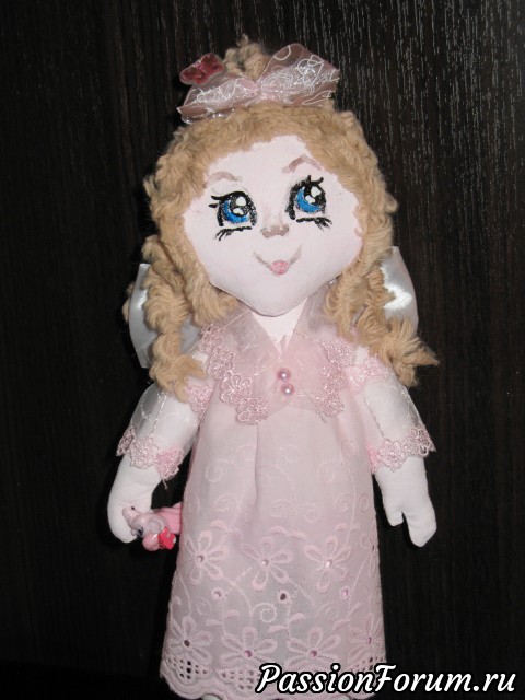 Ну вот теперь у меня трио маленьких феечек!))) Третья - феечка Розовых Грёз!))) Вся такая нежно--нежно розовая! Она умеет исполнять заветные мечты!))) Платьице у неё из батистового шитья и капроновых кружев. Волосики тоже из той же пряжи, только покрасила в другой цвет. По-моему ей такой цвет идёт!)))