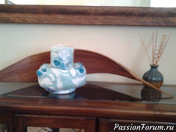 После первого сарафана в апреле сваляла ещё, но подлиннее. Основа- белая марля разрежинная, далее - 18 микронный меринос белего цвета, и верхний слой - декор: нитки шёлк/шерсть коричневого цвета, маргиланский шёлк кусочками ( раскладка по принципу витража), маки из тогоже шёлка, мной крашенного, и напоследок флис альпаки белый мелкими кудряшками разбросаны в качестве эксперимента. Флис в последствии пришлось сострич практически до пояса. Очень не приятно торчал по сторонам, а вот по подолу интересные завитушки получились. Края делала по МК (кажеться) Селезнёвой. Это где по краю приймы, горловины тоненький жгутик прокладывают. Девочки это изумительно работает. Края получились ровные, довалка не нужна. Теперь всё буду делать с этой замечательной техникой.