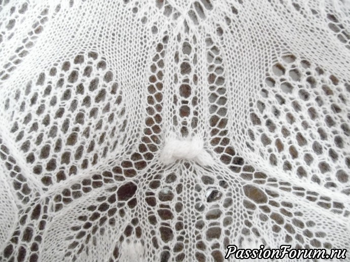 Обвязка края шали взята из шали (бактуса) "Французский канкан". Край закрыт спицами с применением крючка (выдают пико над дугами). Радует меня самого себя применение узора, имитирующего вязание крючком на вилке.