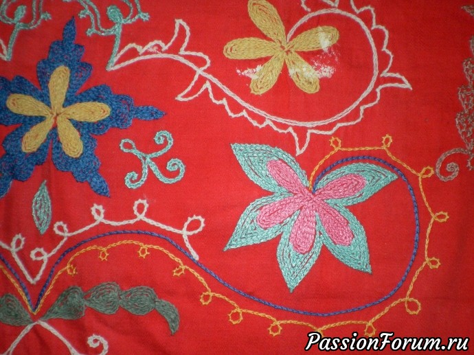 Думаю, что особой символичности в колорите в данном случае нет: исходили из того, что имеется в наличии и из принципа «чем ярче, тем лучше». Красивые вещи. Узбекская национальная вышивка тоже тамбурным швом, в основном, и шелковыми нитками. Удачи!