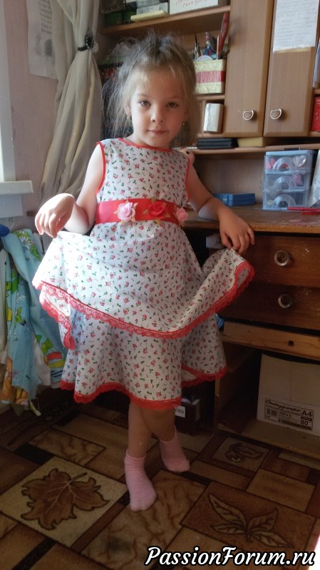 Ну вот и сшилось новое платье для моей любимки..Платье с о слегка завышеной талией.Двойная юбочка полу-солнце(люблю я на детках такие юбочки).Хотелось украсить нежно зеленым,но в нашем небольшом городе не нашла все в одной гамме,и решилась на отделку в красном.Когда я в магазине увидела этот ситчик-уйти без него не смогла.И шилось оно 2 часа..К нему еще прилагаются 2 резинки с такими же розочками ,какими украшено платьишко...Аннушка моя разлохматилась-пришла с прогулки и переплетаться не захотела,но фотографироваться пошла с удовольствием.Извиняюсь за задний план