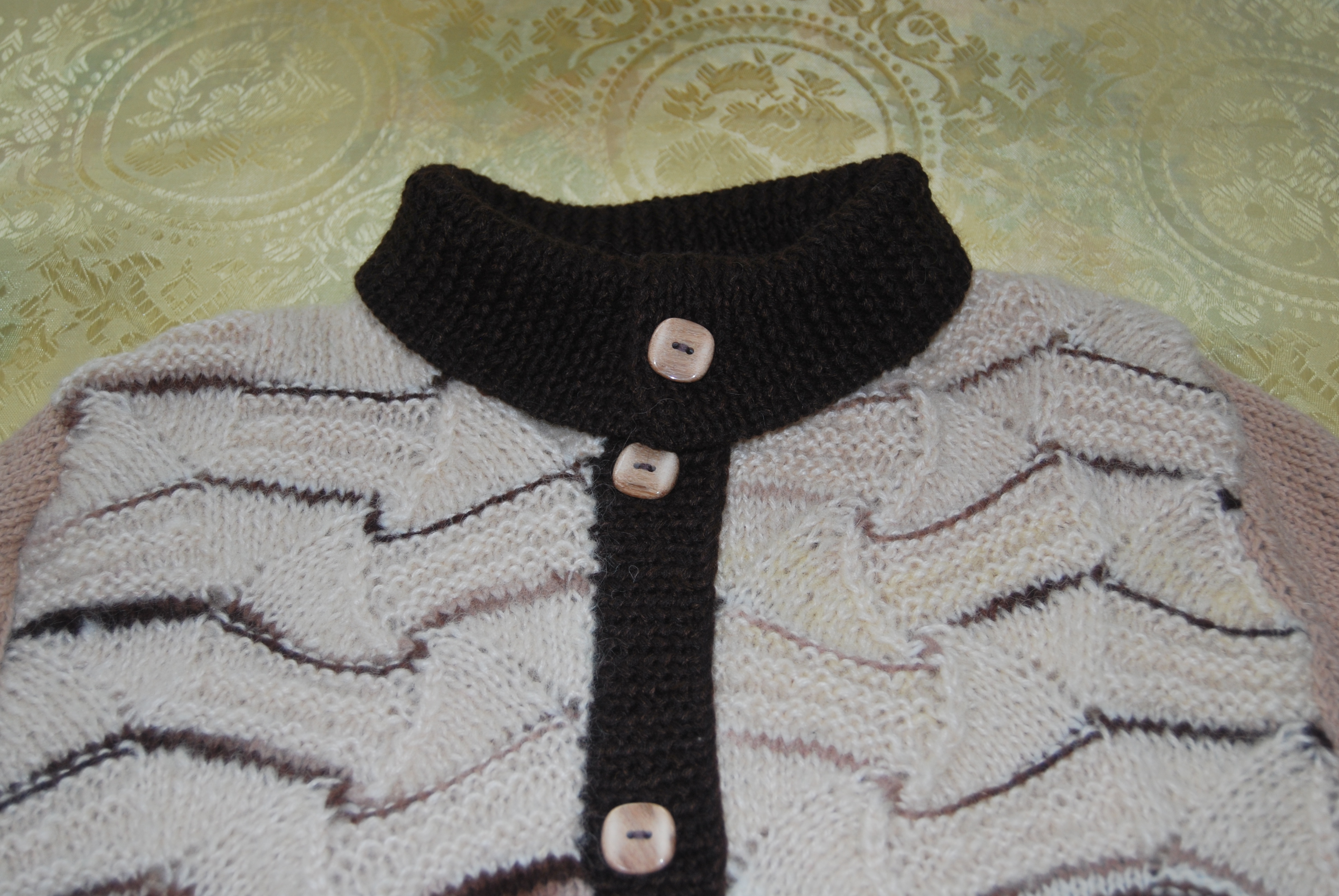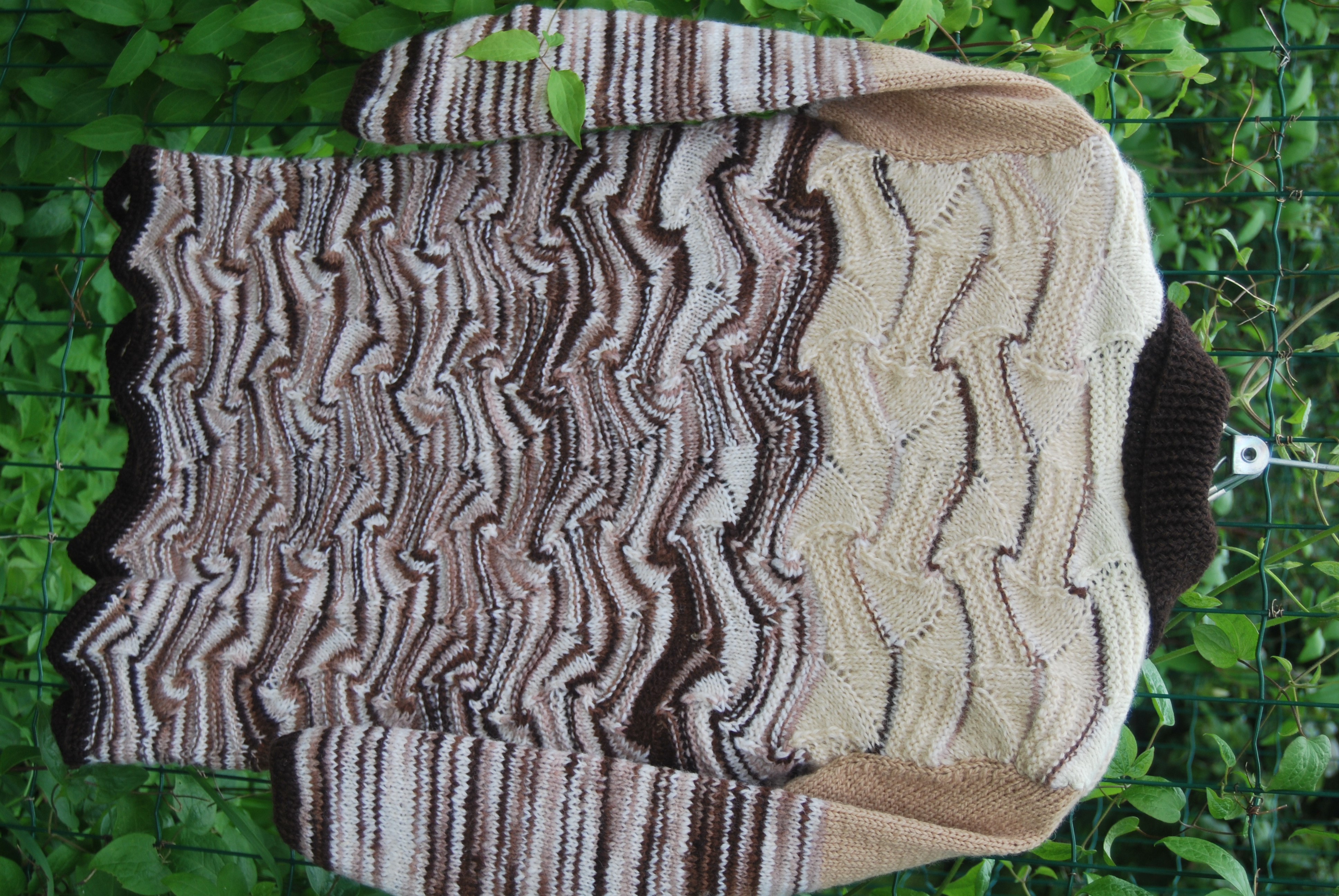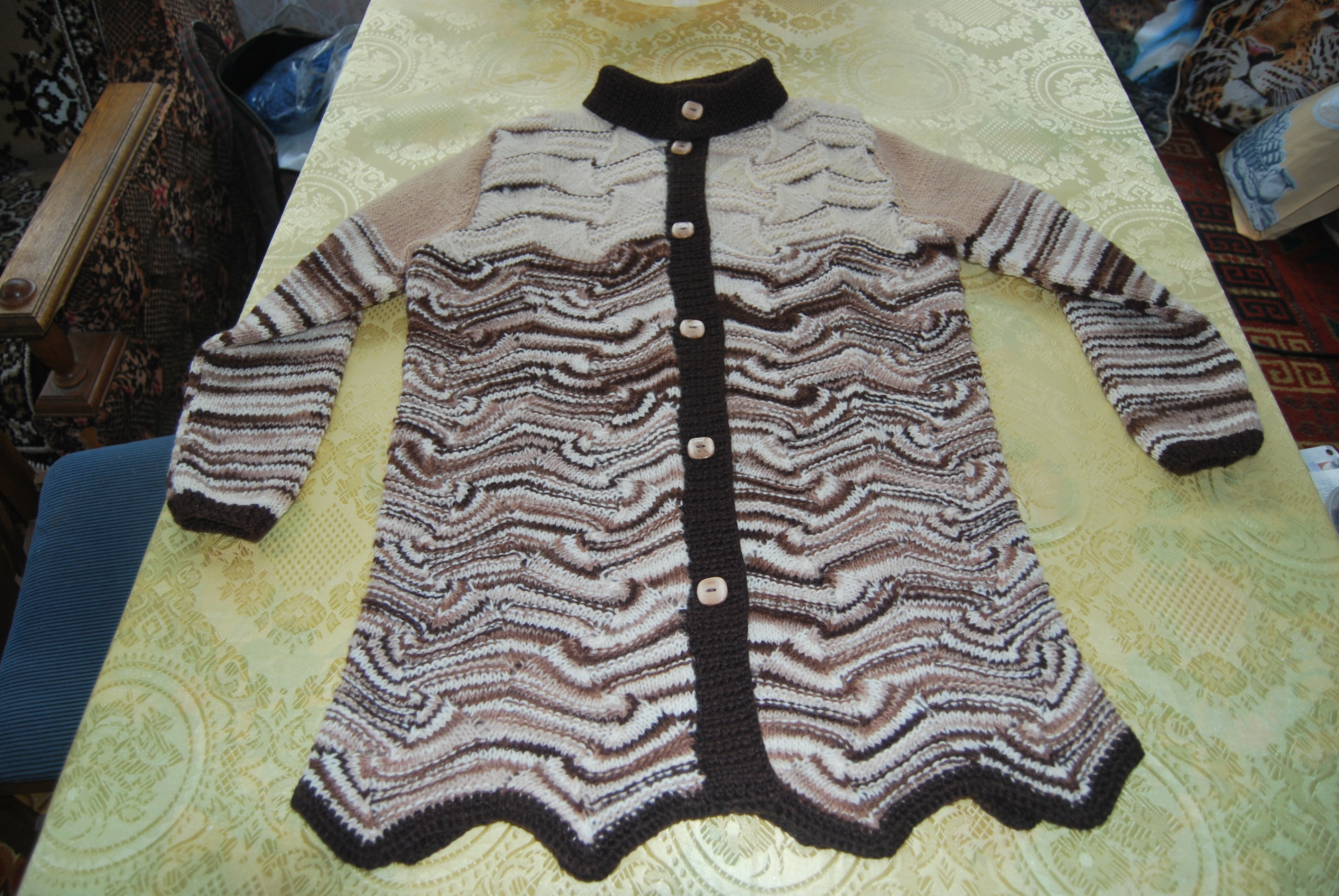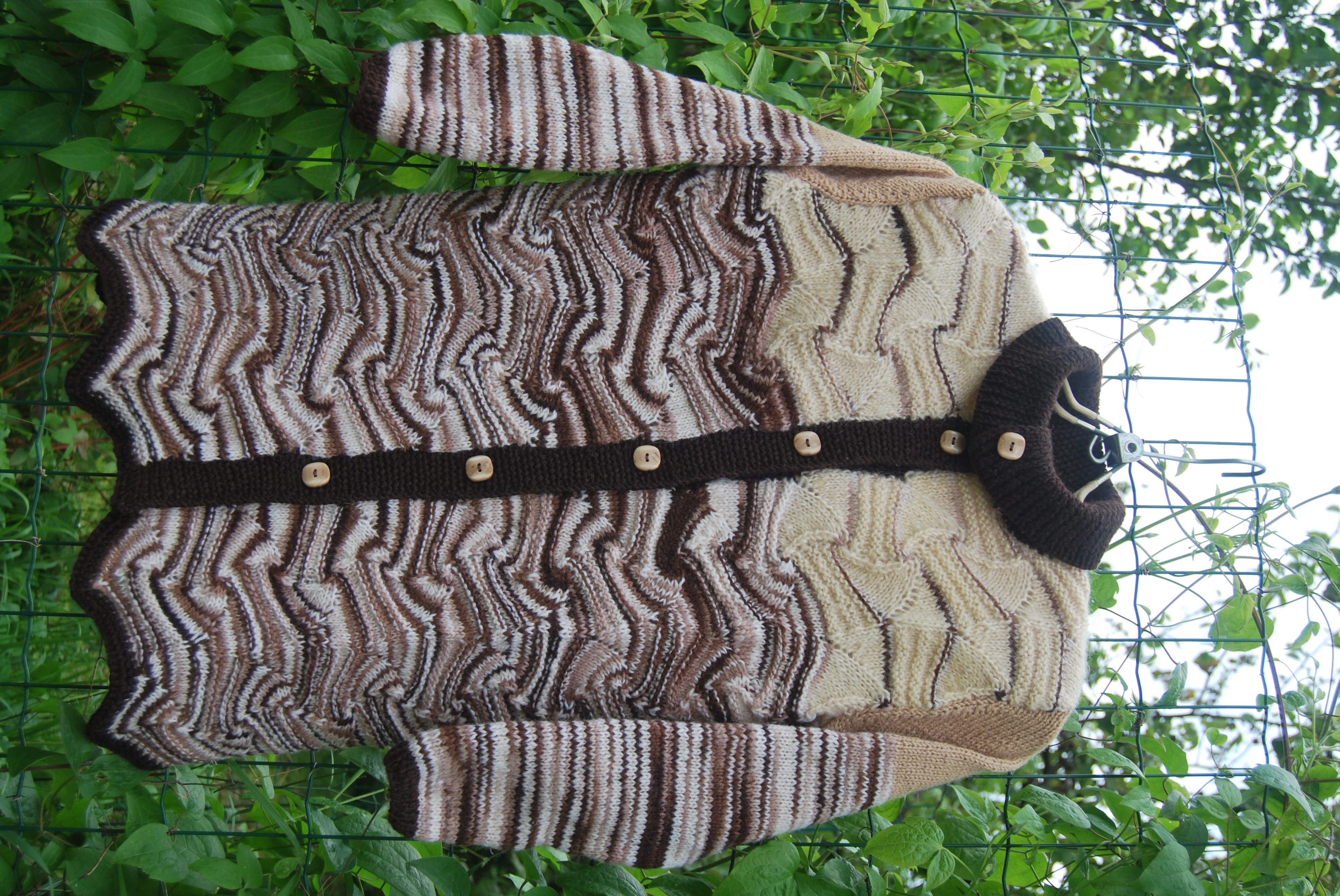 Связано оно из остатков прибалтийской пряжи ручного прядения и секционного крашения.В 90-х годах родители привезли мне из Прибалтики пряжу,из которой был связан длинный жилет с кистями( очень красивый)-он сразу уехал в Израиль.но кисти я сделала в последствии из белой пряжи- так было красивее-а нарезанная пряжа так и осталась.Очень люблю узоры Миссони-простые уже вязала,а для " морской волны"нужна была пряжа с секционным крашением.Вот так и сошлись желания-кусочки по 30-40 см пришлось размотать на 2 ниточки-уж очень мало было пряжи,присоединить другие остаточки(тех же 90-х,включая пуговицы)- и вот результат.