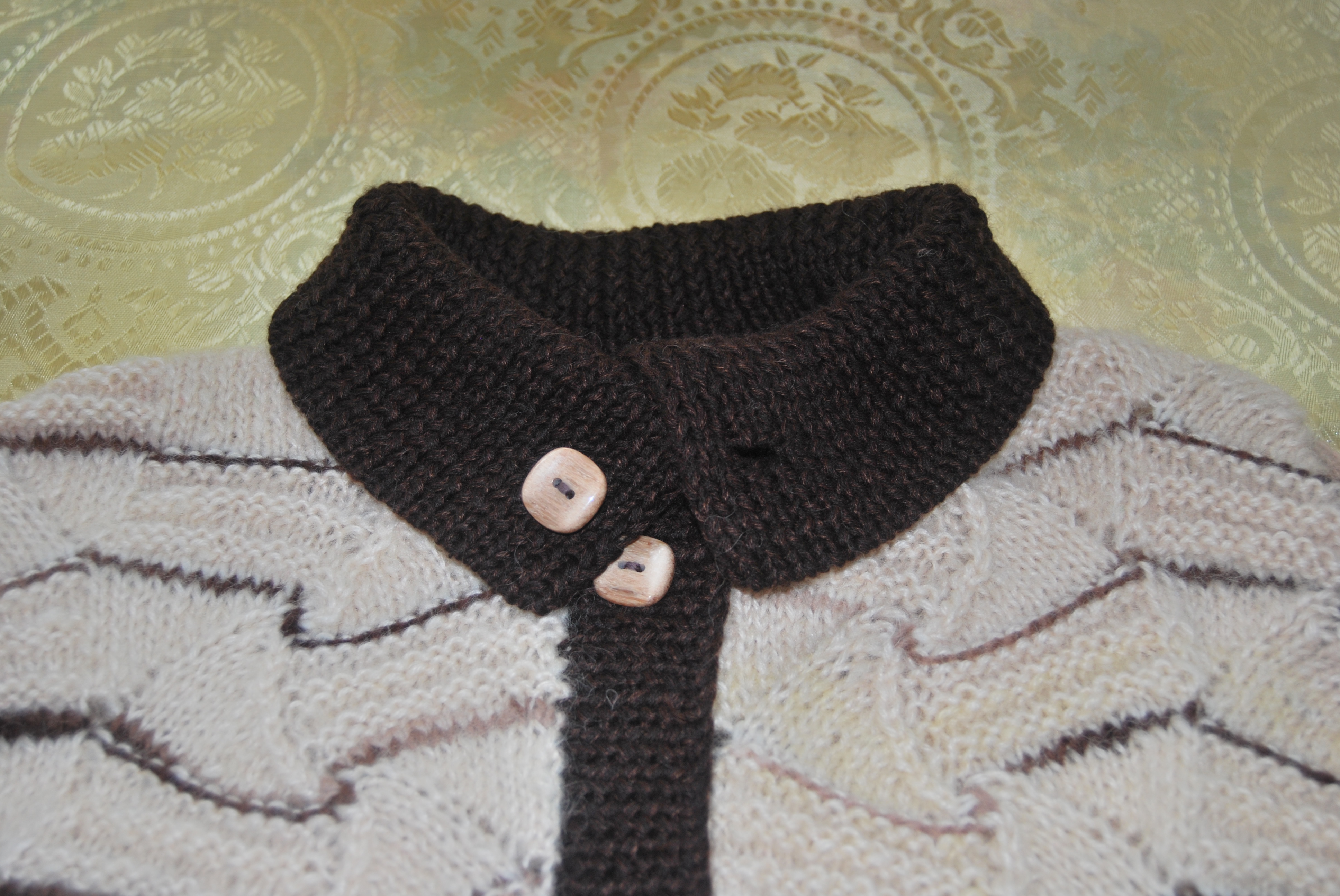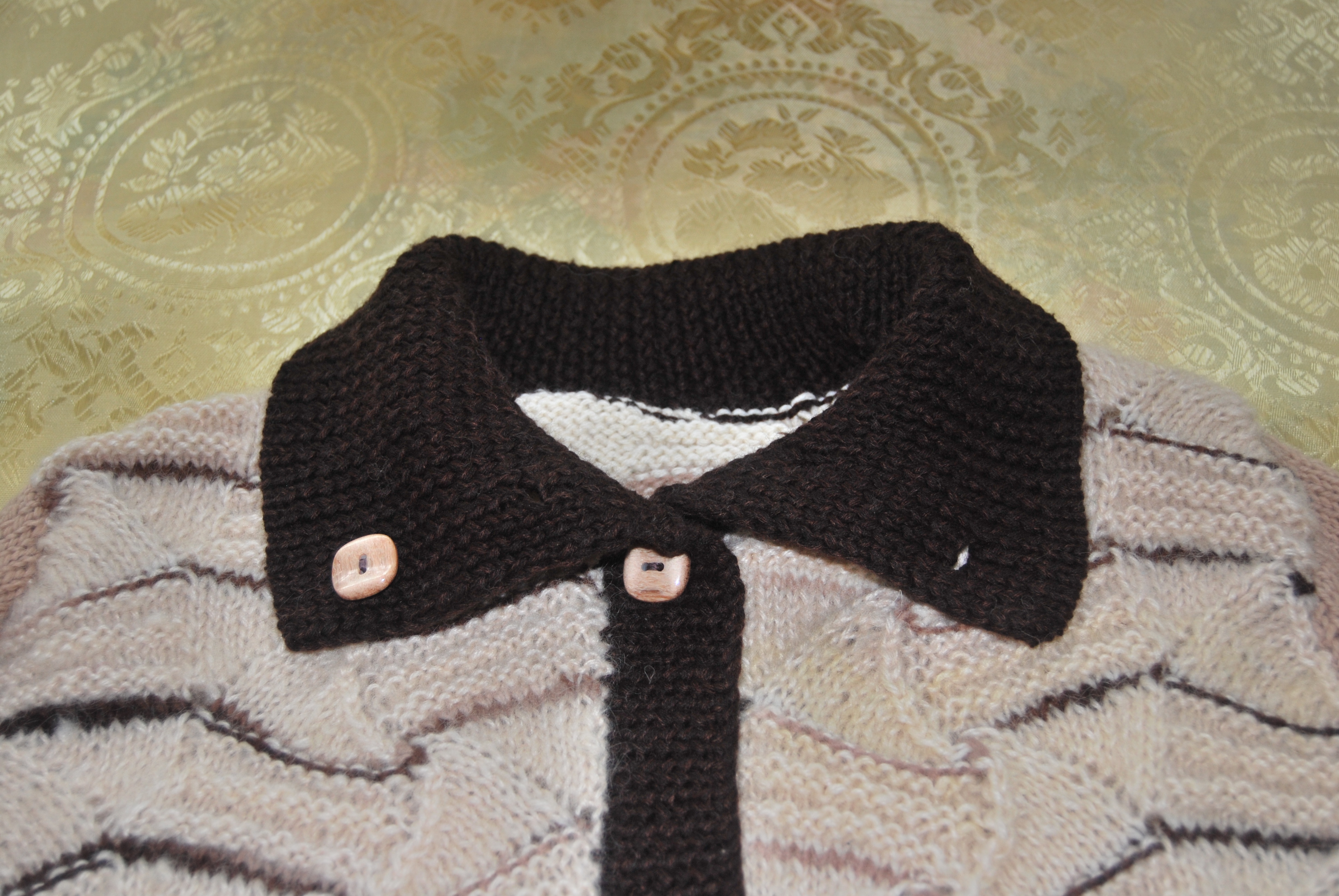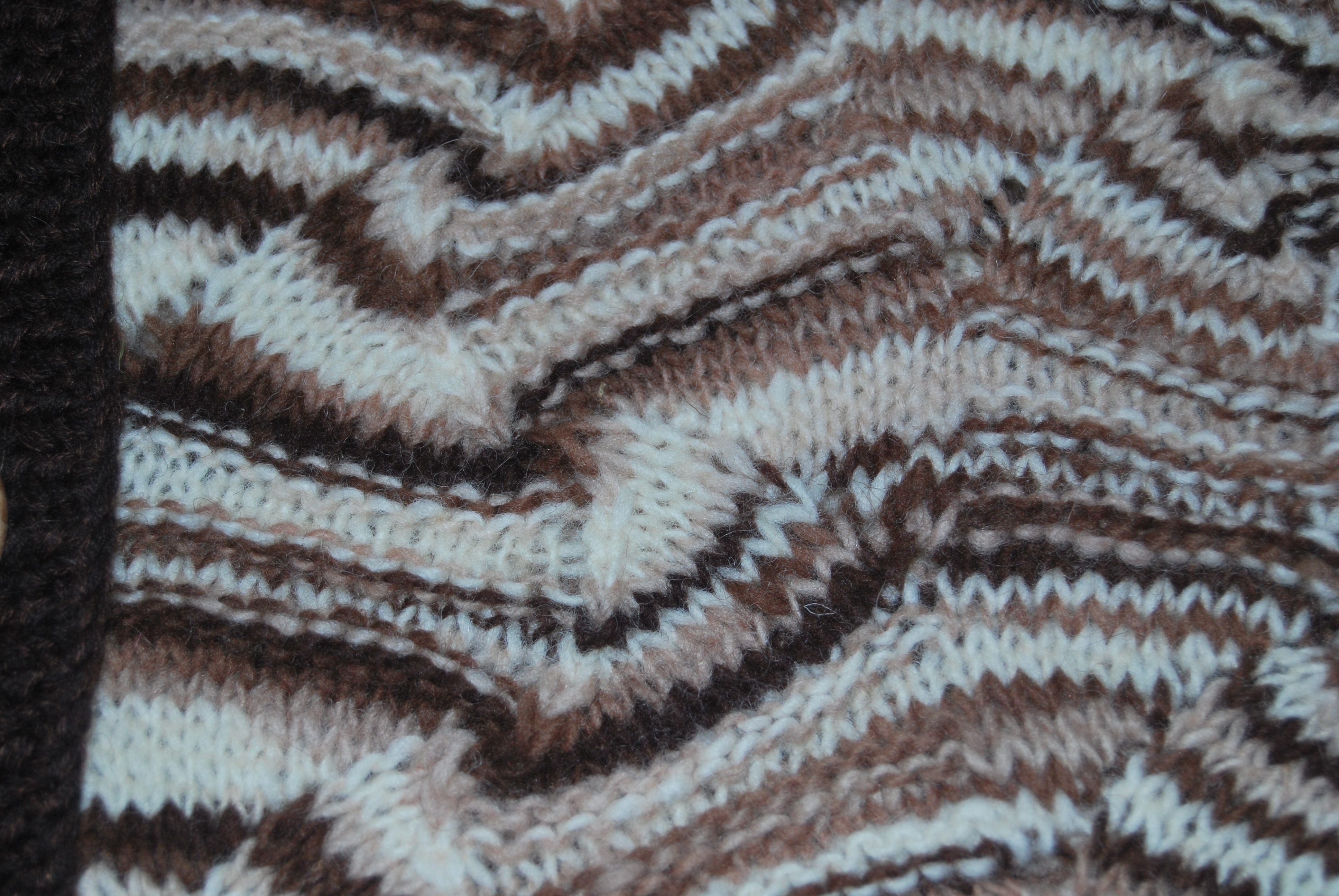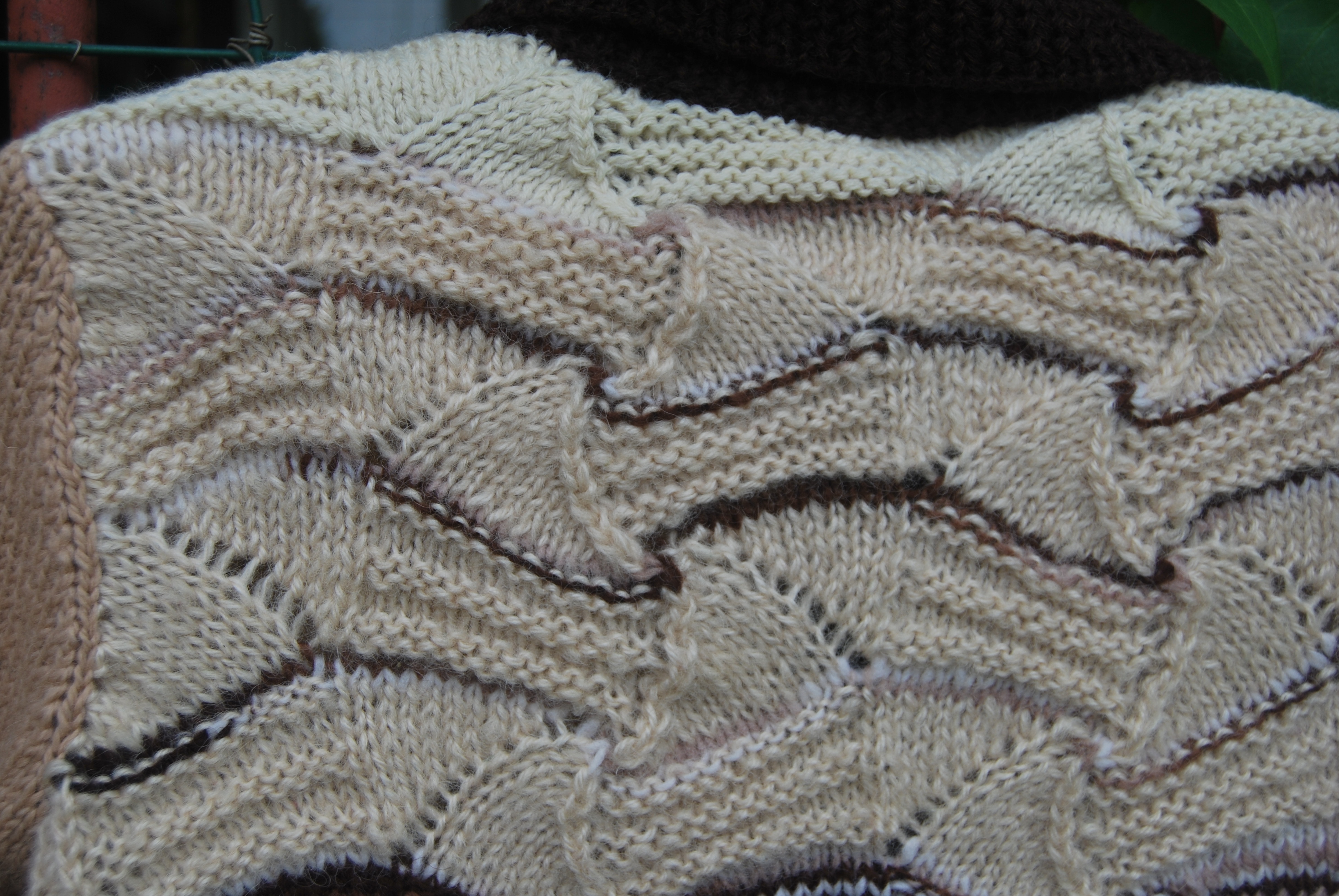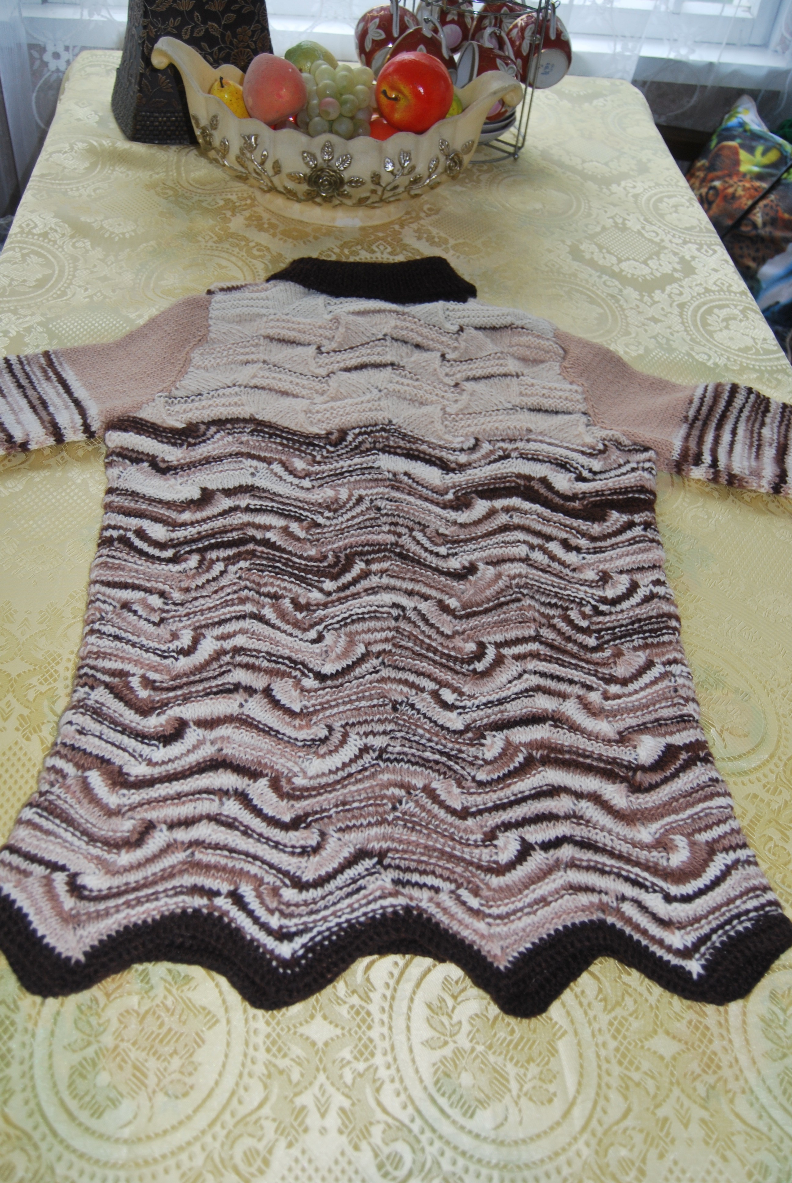 Связано оно из остатков прибалтийской пряжи ручного прядения и секционного крашения.В 90-х годах родители привезли мне из Прибалтики пряжу,из которой был связан длинный жилет с кистями( очень красивый)-он сразу уехал в Израиль.но кисти я сделала в последствии из белой пряжи- так было красивее-а нарезанная пряжа так и осталась.Очень люблю узоры Миссони-простые уже вязала,а для " морской волны"нужна была пряжа с секционным крашением.Вот так и сошлись желания-кусочки по 30-40 см пришлось размотать на 2 ниточки-уж очень мало было пряжи,присоединить другие остаточки(тех же 90-х,включая пуговицы)- и вот результат.