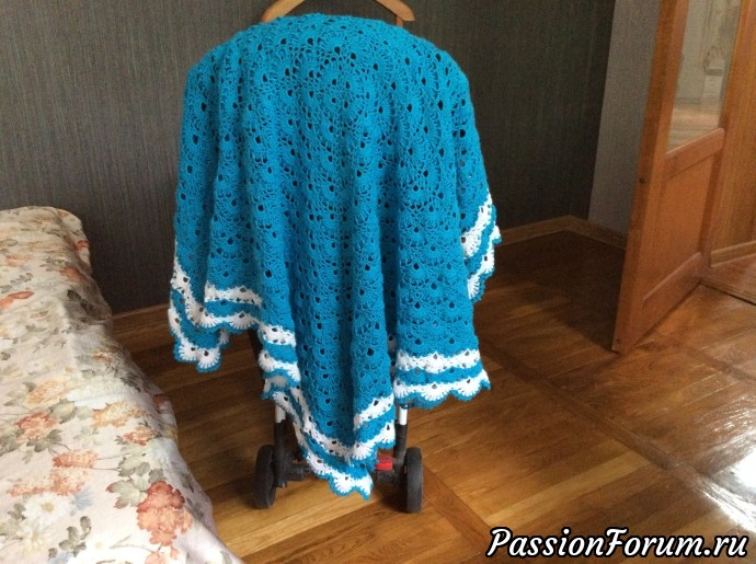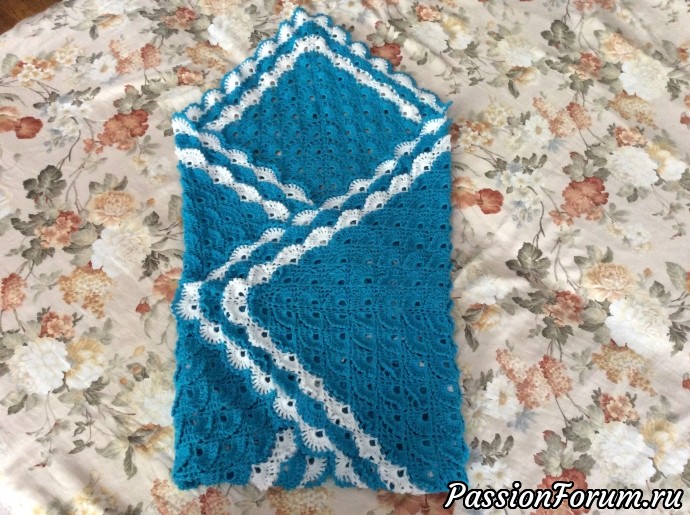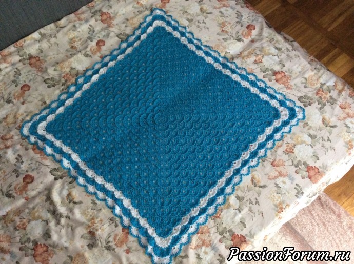 Отдыхаю с дочкой и внучками в Анапе. Город и море все знакомо много, много лет. Июль, жара... А вот море в этом году очень похоже на родную Балтику. Не парное молоко, как мы ожидали. Но всё равно купаемся, даже внучки , кроме самой маленькой. Но даже на отдыхе без любимого крючка никуда. Взяла с собой очень давнишнюю незаконченную работу детский плед. Узор очень известный, мне нравится, но довольно трудоемкий. Однако закончила. Получился плед морской, синий, синий с белой пеной. Такой мягкий, очень пластичный. Нитки турецкие, хоть и 100% акрил, но очень, очень приятные.