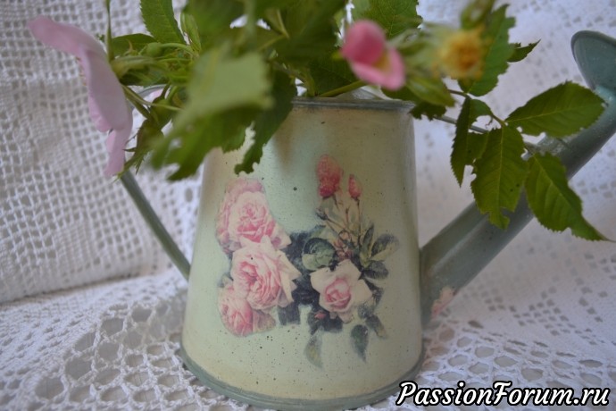 Здравствуйте, дорогие декупажницы! Долго не могла показать вам свою лейку, сначала болела, потом, вдохновлённая топиком Марины(мадам Лаваль) вязала юбку крючком. Никак руки до фото не доходили, да ещё эта жара просто изматывает. Вот, наконец,показываю вам мою многострадальную леечку. После вашей критики убрала все корявые тени, так и вправду лучше.