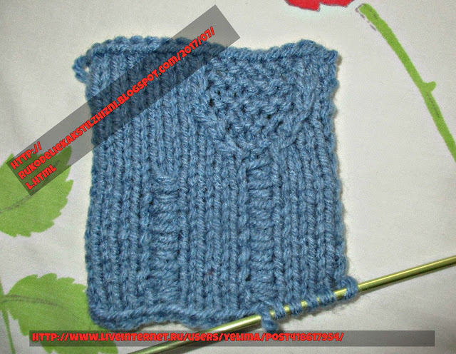 3 ряд- 1 изн, * 2 петли снять непровязанными, протянув нить сзади этих петель*,3 изн,повторить между * *,3 изн, повторить * *,в конце-5 изн.