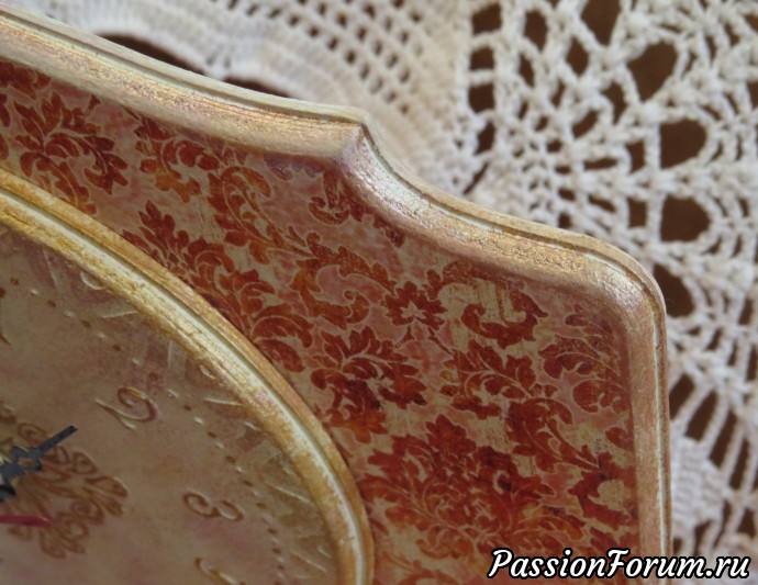 Началось с того,что не оказалось трафарета нужного диаметра, для накладки-или больше или меньше,решила распечатать циферблат,но принтер воспротивился))))периодически с ним бывает такое, и нарисовал мне рисуночки бледными полосочками))),пришлось вживить распечатку и сверху рисовать))).Обвела циферки и орнамент контуром, а потом взяла и замазюкала все красочкой))))) т.к. решила по краю еще шпатлевкой орнамента добавить,подходящего трафарета снова не нашлось))пришлось кусочками,а это сильно затянуло процесс)))