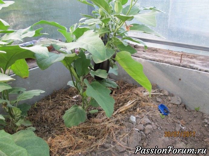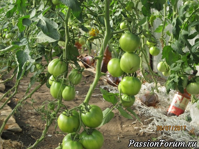 2. Помидоры замульчировала газетами или резаной бумагой, в отверстия воткнула бутылки, в них наливала подкормку органикой. Кажется мне, что слабоваты помидоры. Но (тьфу...) пока не болеют.