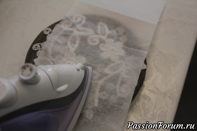 Как только оно немного подсохнет, проглаживаю кружево через кальку, чтобы оно плотно легло на ткань, хорошо приклеилось и было ровным.