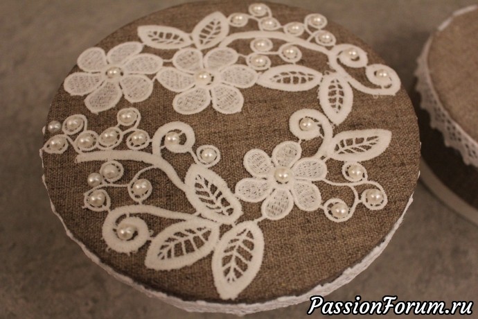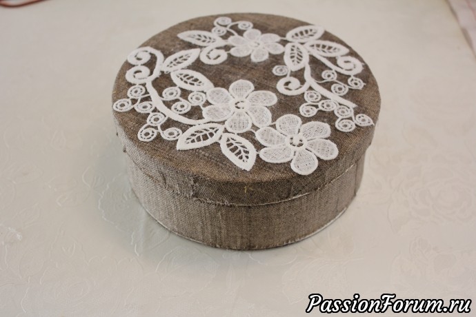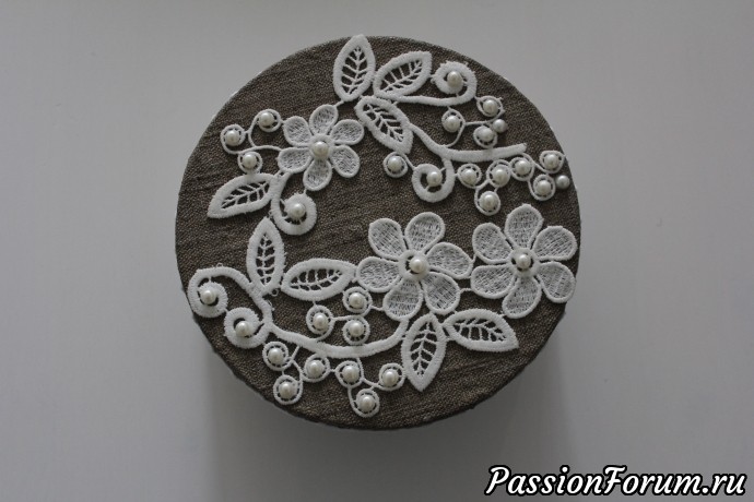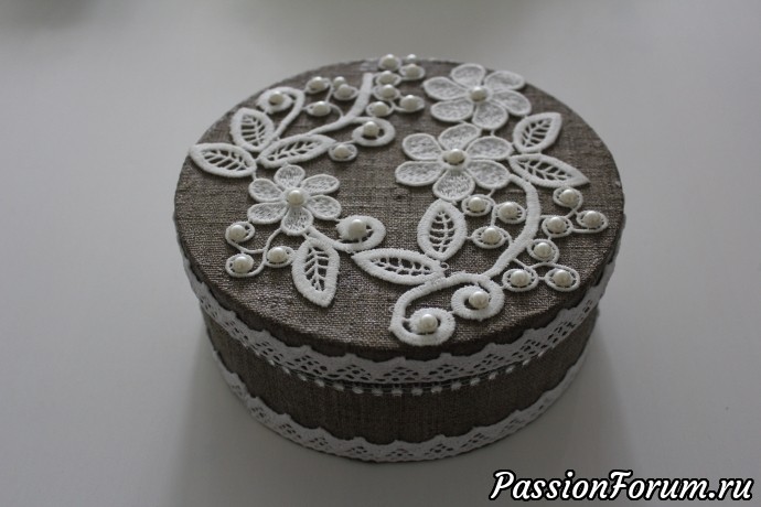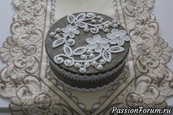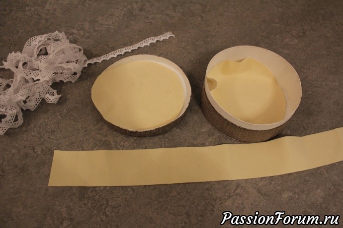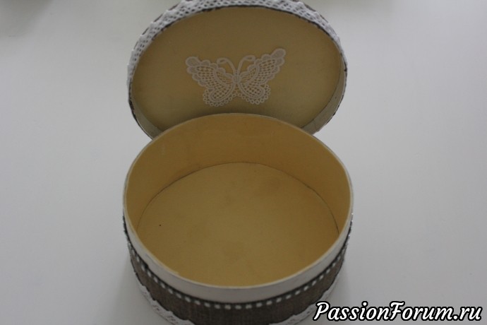 Выбрала кружево для внешнего украшения и ткань замшевую бежевого цвета для оформления внутри.