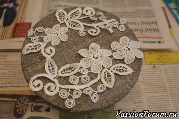 Кружево также клею снаружи клеем ПВА, и внутри приклеиваем ткань этим же клеем. Стенки стали очень твердыми и крепкими.