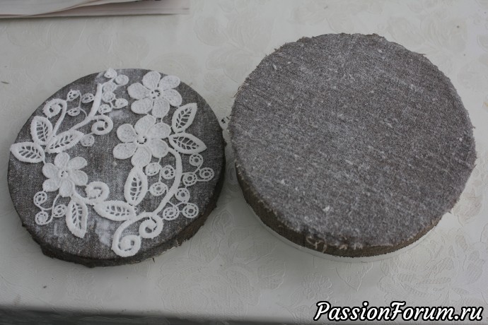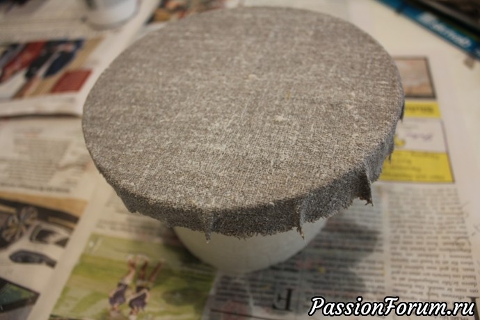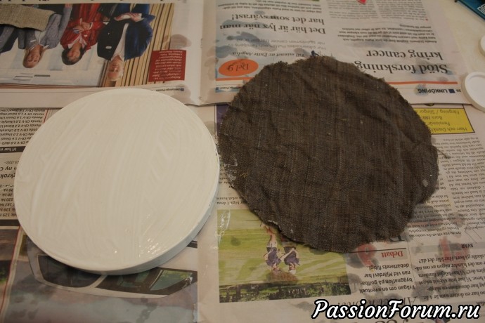 Крышку обильно смазываю клеем ПВА, а ткань замачиваю.