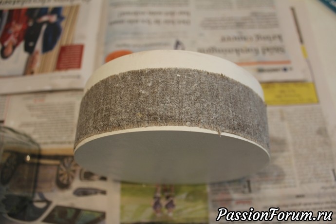 Была у меня заготовка круглой шкатулки из бересты с очень тоненькими стенками, гибкая и хлипкая, в двух местах треснутая, диаметром 16 см. Хотела даже выбросить ее, а потом подумала и решила обклеить ее снаружи и внутри тканью, чтобы залечить и укрепить бедняжку. Сначала загрунтовала белой краской. Нашла ткань из мешковины, вырезала круг на крышку и полоску на боковину.