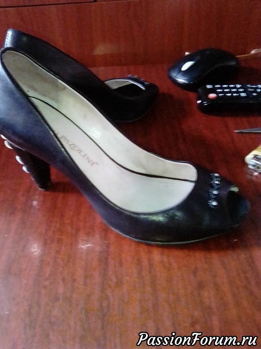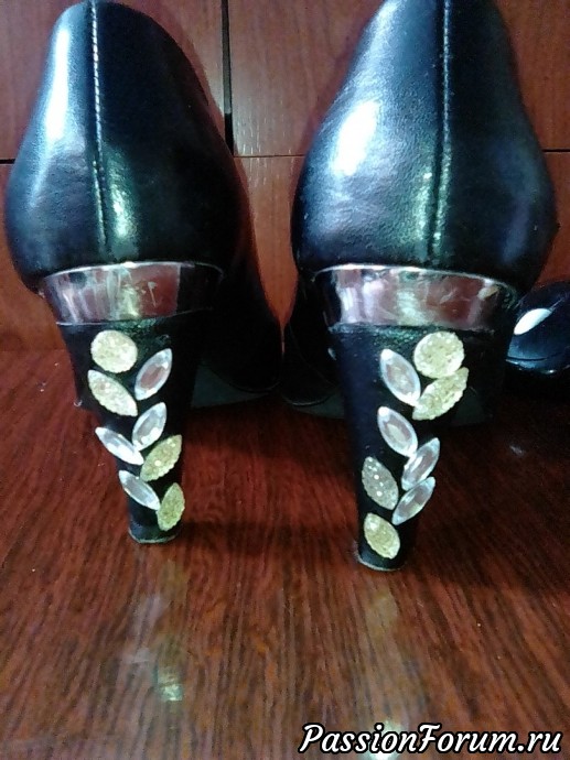 Доброе утро всем мастерам и рукодельницам!Попали ко мне туфли ,удобные но с каблучками беда -ободраны.Сестра отдавая сказала ты ж что нибудь придумаешь вот и придумала похулиганить немного .Обклеила каблуки куском тонкого кожзама ,приклеила стразы и спереди немного блеска ввиде страз и готово.Сначала хотела просто обклеить каблуки ,но потом подумала и наклеила стразы на каблук хотя и боялась что могут отвалиться стразы и наклеила их на клей момент.И вот что получилось.Это мой первый эксперимент с туфлями -надеюсь не слишком аляписто получилось.Спасибо всем кто дочитал до конца топик ,учту на будущее все советы и критику ,спасибо.