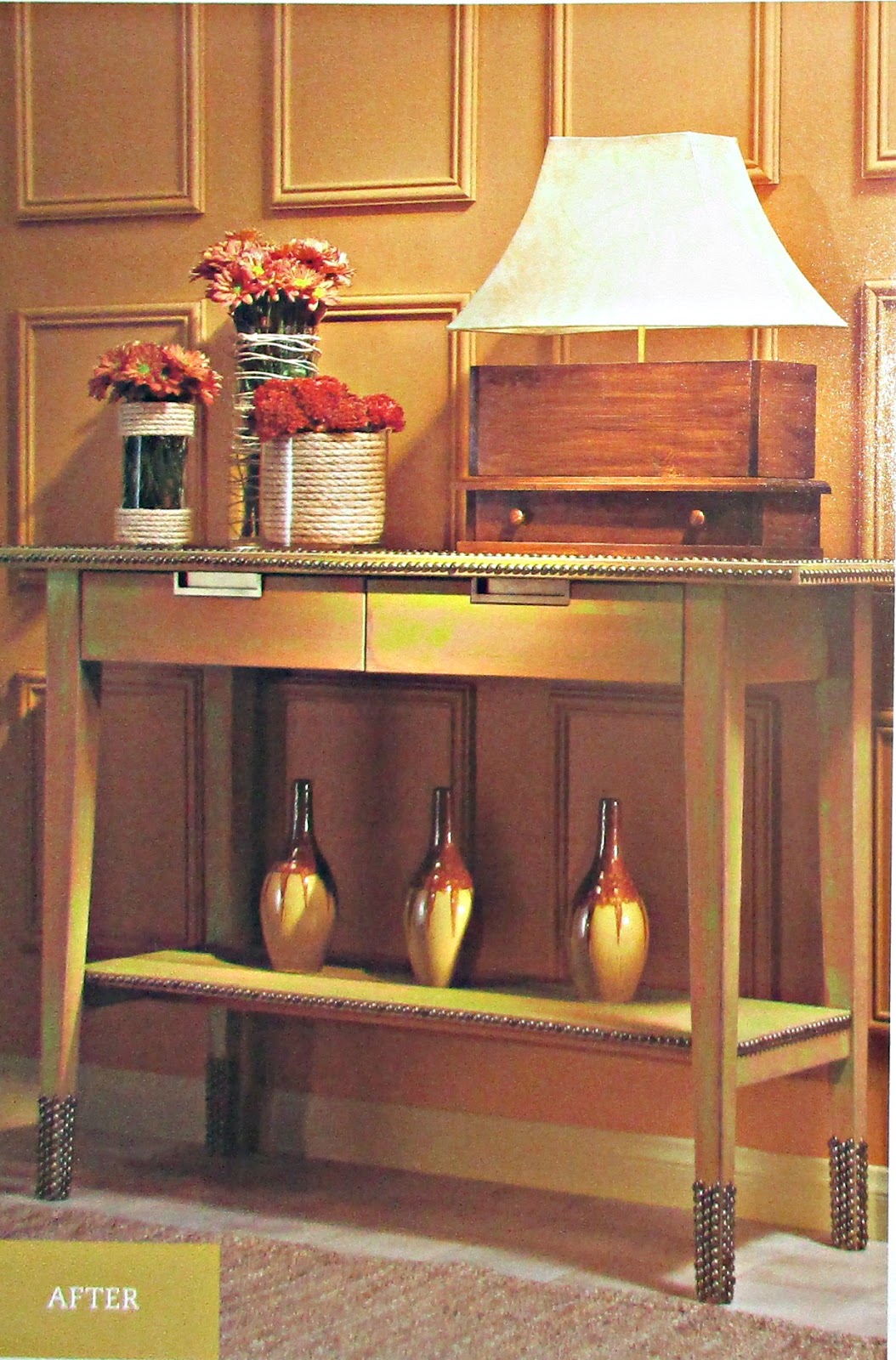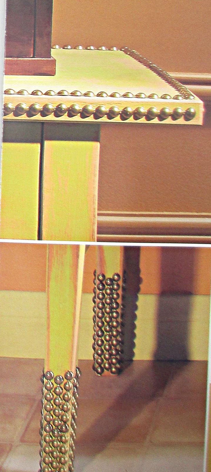 Множество гвоздиков со шляпками, вбитые по кромкам мебели-придадут шарм простой мебели: