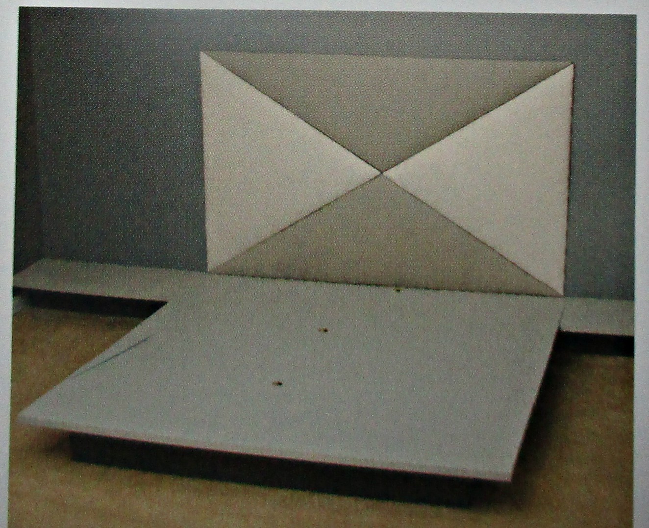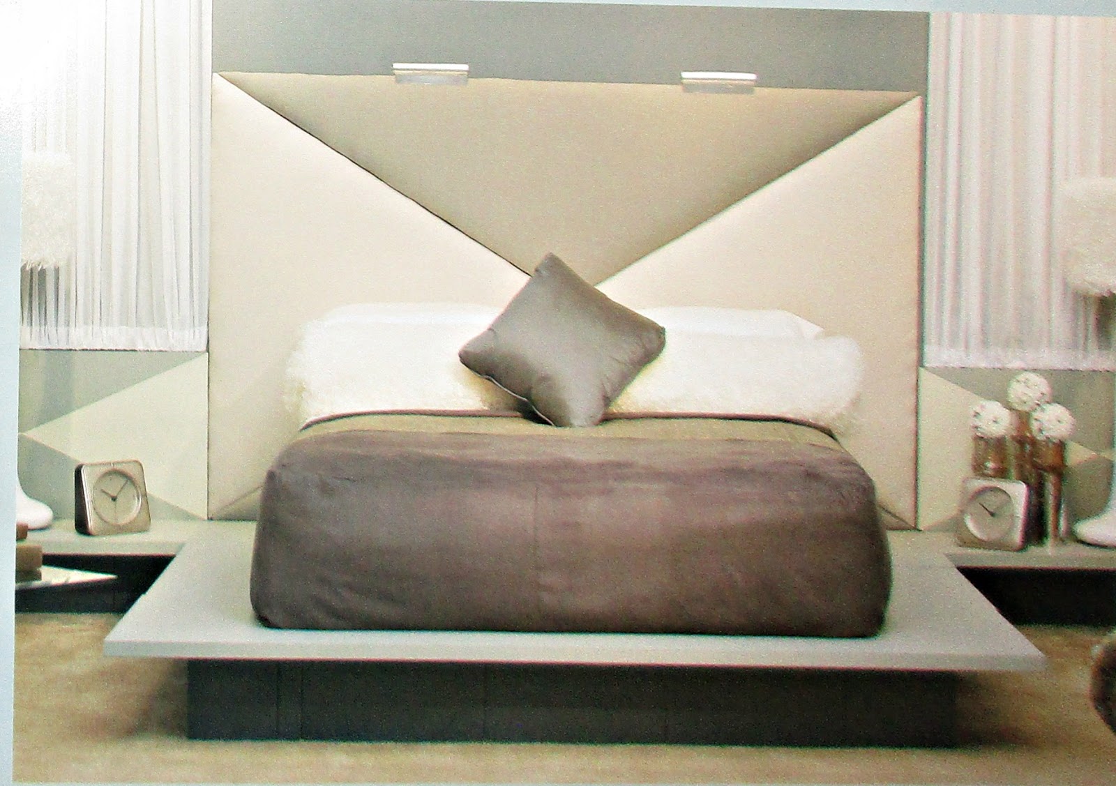 Изголовье кровати можно сделать мягким, из натяжных треугольников ткани, на основе фанеры