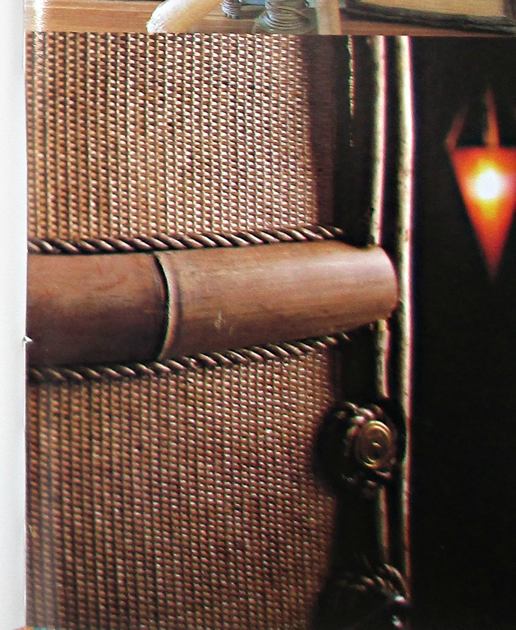 Дверь отделана палками бамбука и кожей, сделанной в технике мелкой плетёнки: