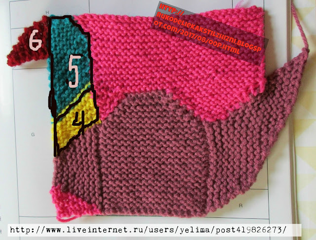 Там, где показан ОТРЕЗОК справа-связала 2 недовязанных ряда, чтоб исправить небольшую вогнутость: