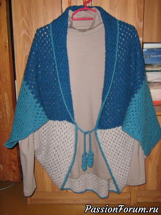 Только мне не хватает вида сзади — никак не представлю, как добавляли третий цвет бирюзовый. Не въеду никак. Начинали его добавлять с каждого края на всю ширину рукава? А на какую глубину к позвоночнику? На четверть от ширины накидки с каждой стороны?