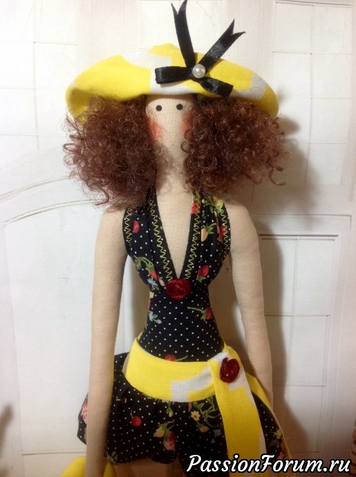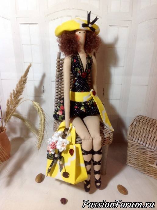Нежная, изящная куколка для любителе красоты и уюта. Выполнена из хлопка. Волосы искусственные. В руке пляжная сумка, цветы, на голове элегантная шляпа. Куколка подарит тепло и уют Вашему дому. Сама не стоит, но очень красиво сидит. Имеется петелька для подвешивания. Не для активных игр. Рост 48 см.