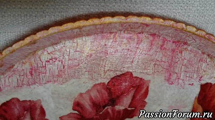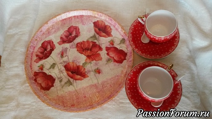 В прошлом году в осенней игре Трое на трое делала подносик. Мне он нравится, это моя удачная работа. Так хорошо вписалась присланная Галей салфетка) Распишу поподробнее, так как это переделка и в игре не удалось показать промежуточные этапы.