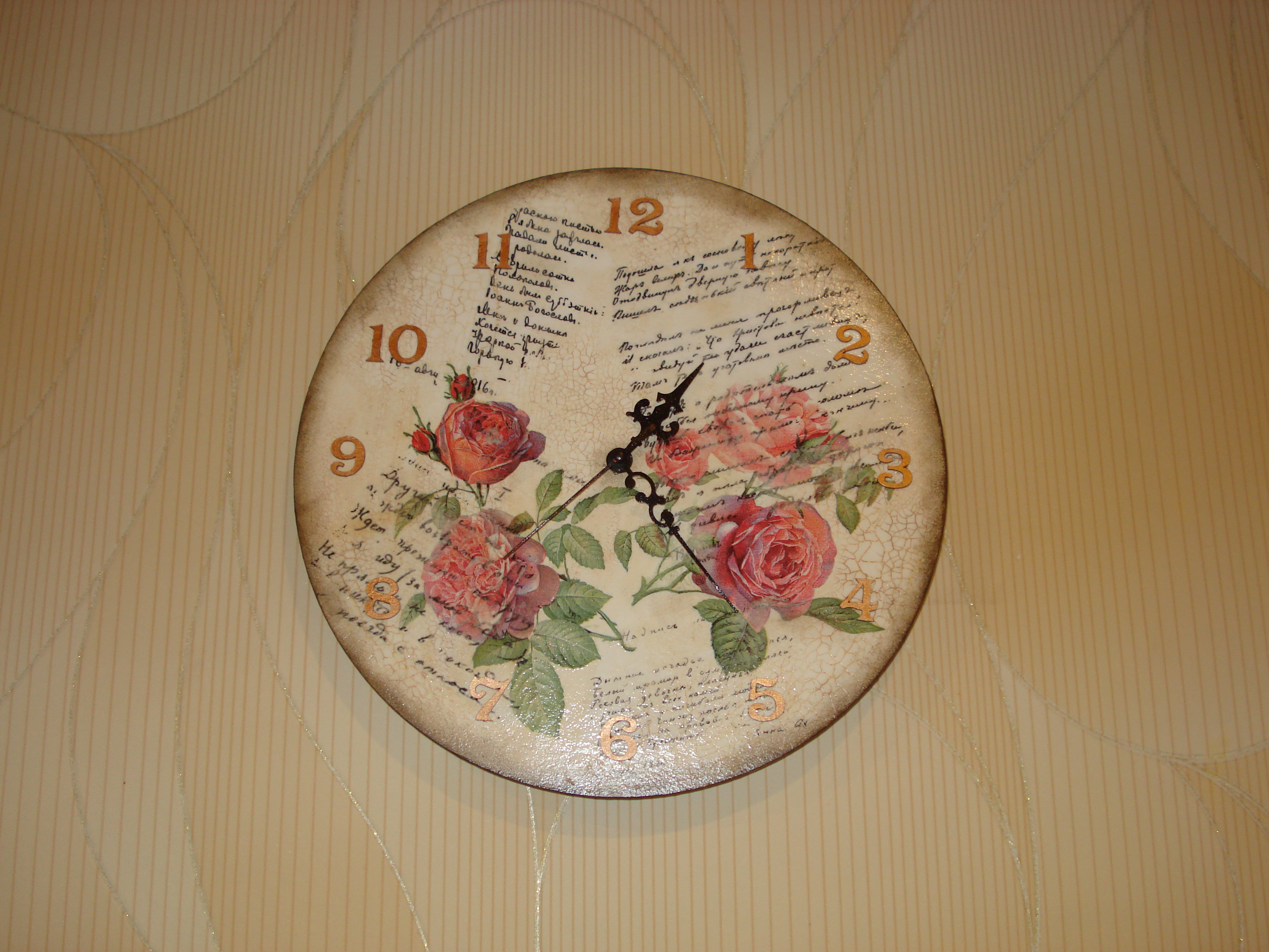 Часы - подарок для учителя литературы, поэтому вживляла распечатки ее любимых стихов. Чуть состарила кракелюром