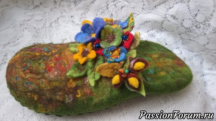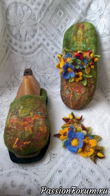 Получила заказ от коллеги свалять тапочки для дочки на ДР. Долго заказчица думала какого цвета хочет тапочки....И заказала со словами: "Хочу смотреть на них и вспомнить о лете!"
