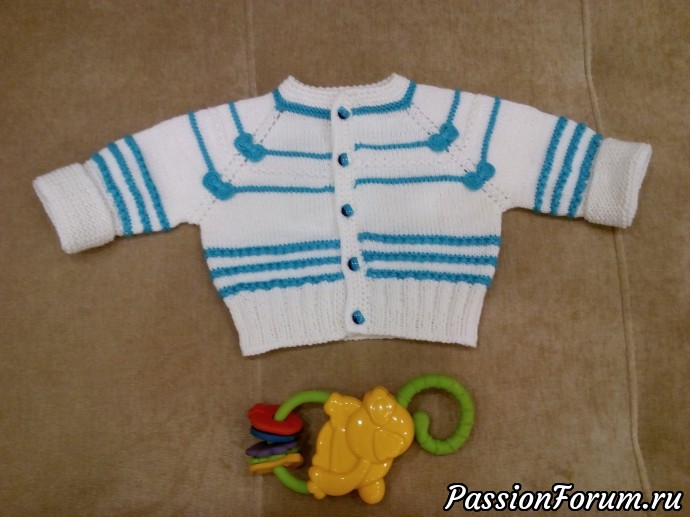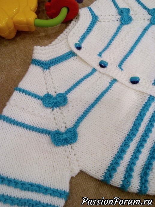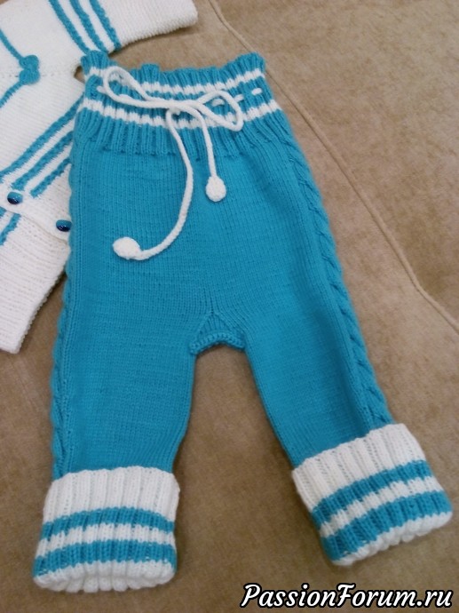 Да и все связано, конечно, спицами, кроме планки для пуговиц и тесьмы в штанишки, ну и обработки горловины рачьим шагом.