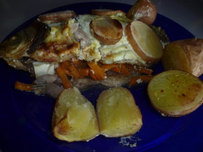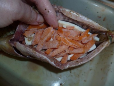 Карасей обычно готовим под сметаной, в пузико по разному кладу лук+морковка и сыр брусочками, заливаем сметанкой, обкладываем картошечкой