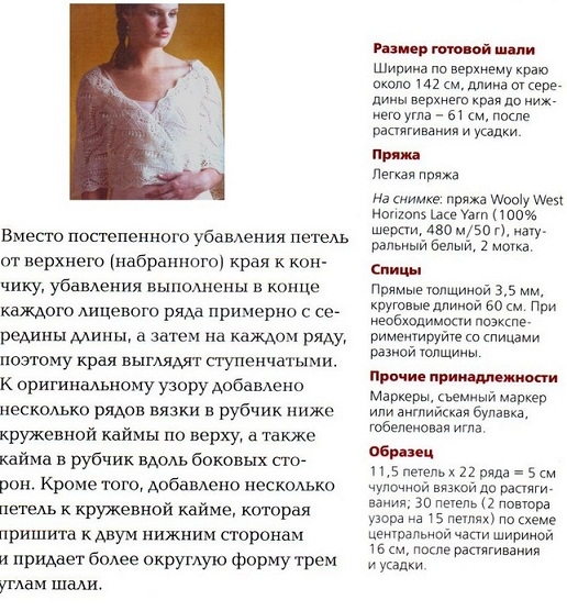 Шаль связана спицами №3,5 из 100 г пряжи (100% шерсть, 480 м/50 г).