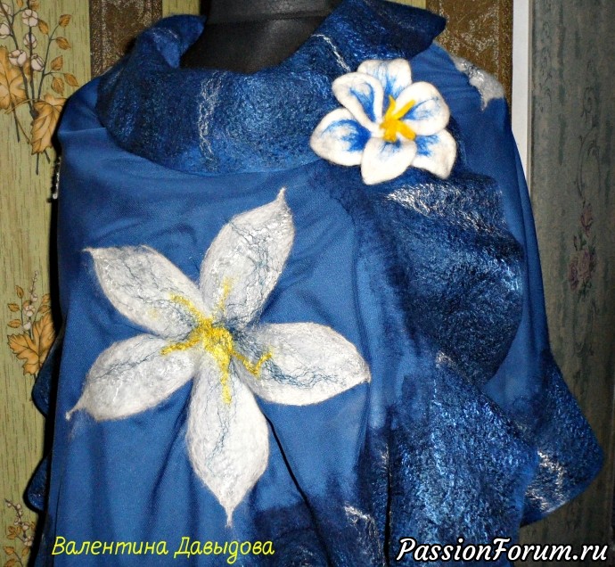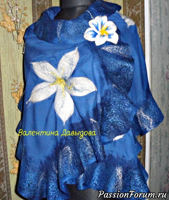 Палантин изготовлен из шифона и тонкой шерсти австралийского мериноса.Палантин тонкий,лёгкий,просто воздушный.Белые лилии эффектно выделяются на тёмно-синем фоне.Такой палантин украсит любой,даже самый простой наряд.Будет идеально сочетаться как с брюками,так и с лёгким летним сарафаном в прохладную погоду.Изготовлен по заказу.Размер 57 х 165.