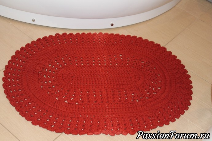 Для моей ванной комнаты он конечно маловат. Расстелила у себя в ванной, так как там теплые полы и ковер быстрей досохнет после стирки. Стирать коврик после вязания надо обязательно. Все петельки встанут на место и ковер расправится и примет свою форму.