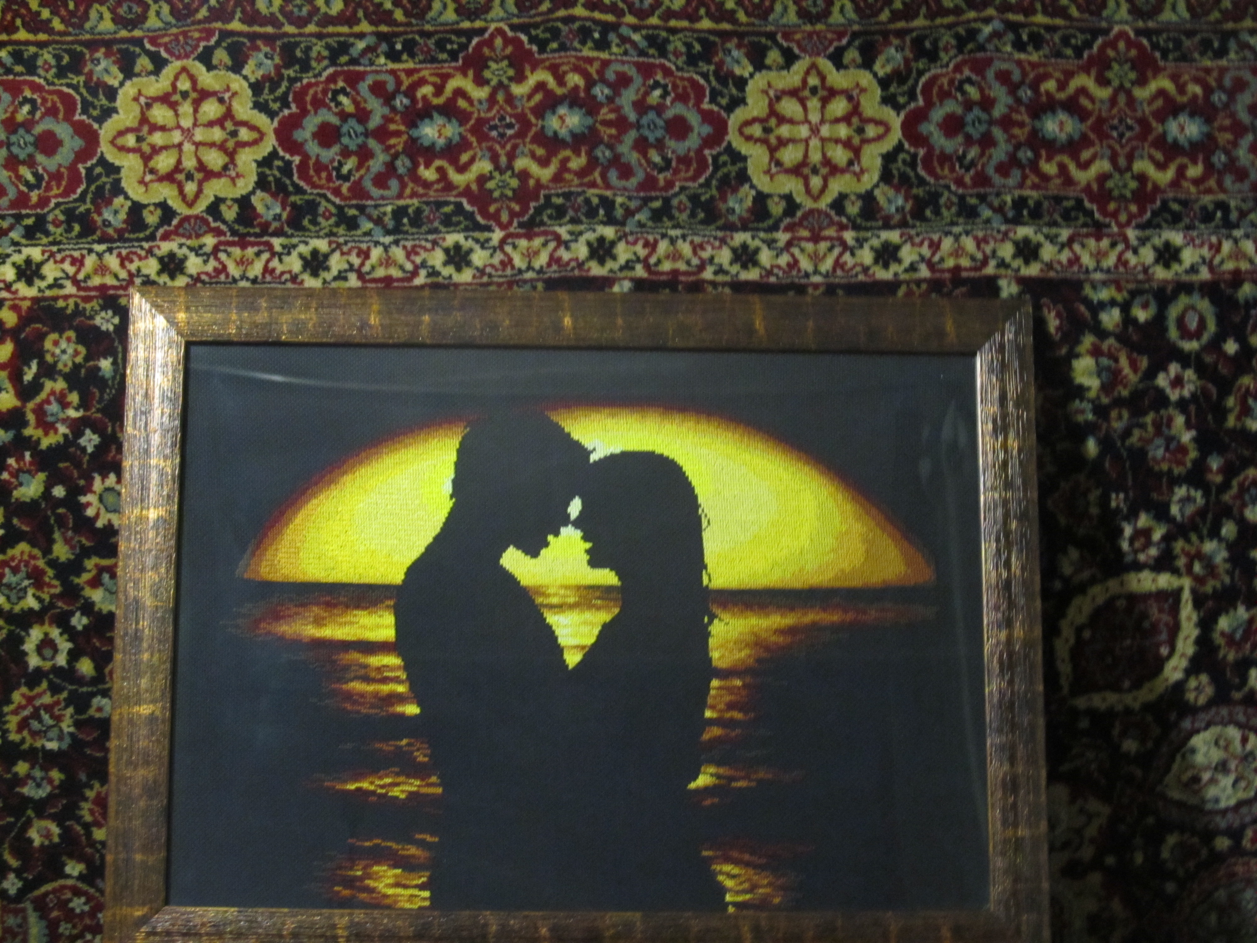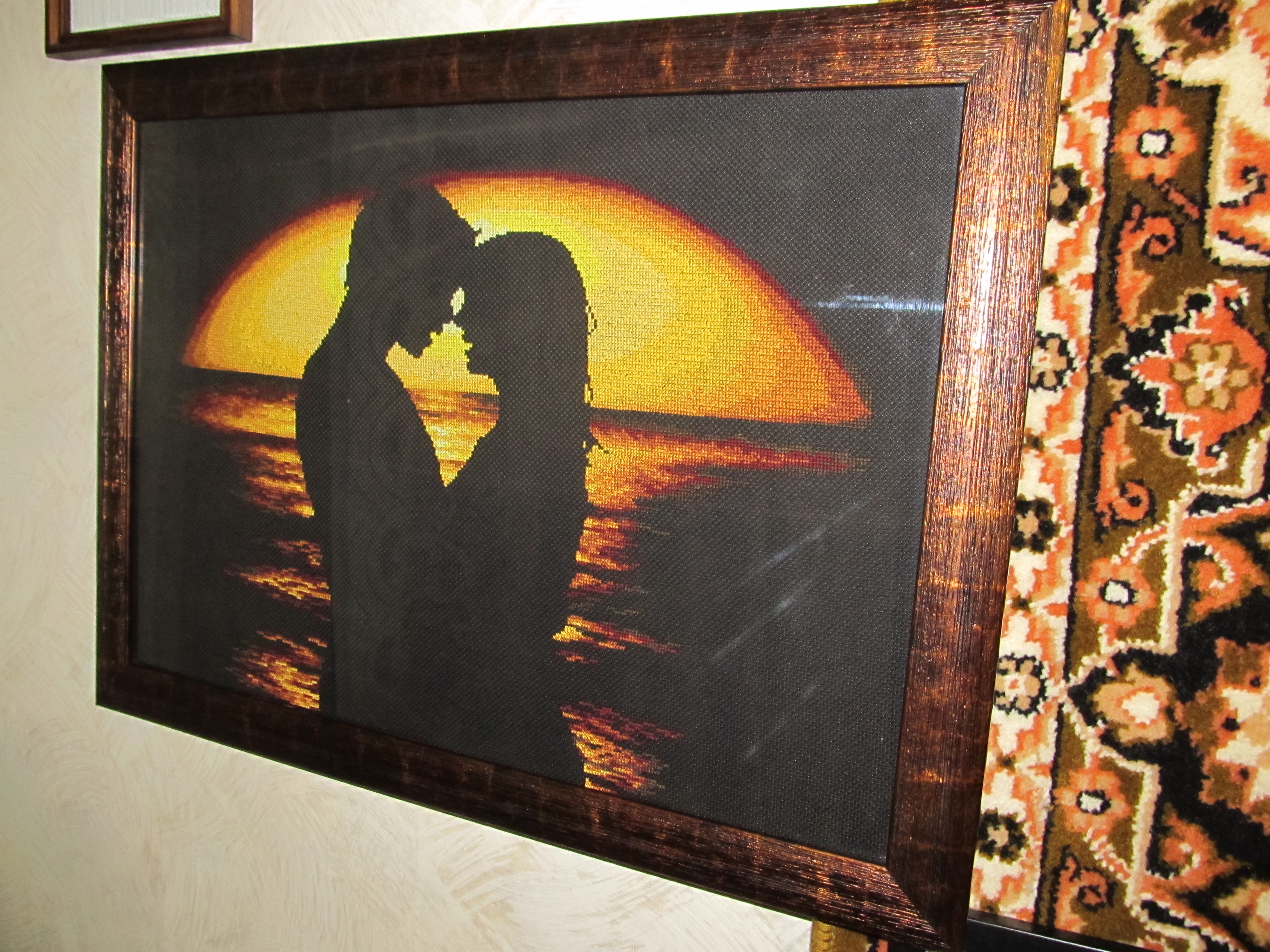 Добрый вечер, девочки-кудесницы! Очень давно вышила одну картину, а оформить смогла только сейчас, и то "спонсоры" помогли. Первый раз в оформление использовала не антибликовое стекло, а обычное. Так как антибликовое гасит черный фон. Но теперь другая проблема - сфотографировать не могу, отражаюсь сама, как в зеркале, и блики, блики... Не судите строго... В реальности смотрится чудесно, хочется смотреть, а вот фото так себе