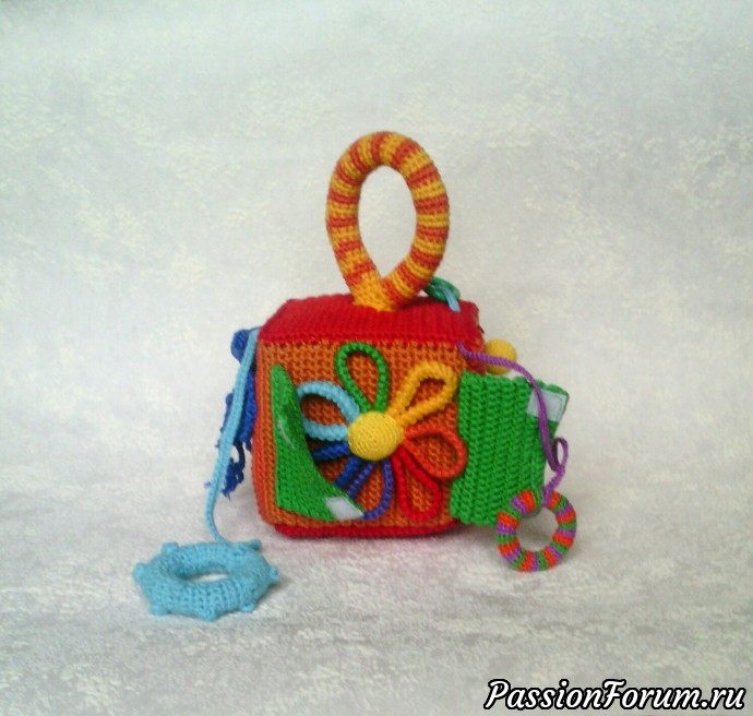 Доброго времени суток всем. Хочу показать Вам развивающий кубик, связанный крючком. Нужен был подарок для малышки 6 месяцев. Пересмотрено было множество разных вариантов. Решила, что это более нужный подарок. Такой кубик, на мой взгляд, заинтересует малышку. Вязаные крючком детали хорошо развивают мелкую моторику рук. За дверками спрятался цветик - семицветик, части гусеницы можно двигать по шнурку, а в кармашек спрятать колечки. Яблочки на яблоне мягкие, а детали гусеницы твёрдые (обвязанные деревянные шарики). Все детали надёжно пришиты или ввязаны в процессе работы, ведь малыши так любят всё дёргать и отрывать. Связан куб из 100% хлопка. Внутри поролоновый куб. Вот связала один, а в голове ещё множество идей. Как же увлекло меня это занятие. Спасибо всем заглянувшим.