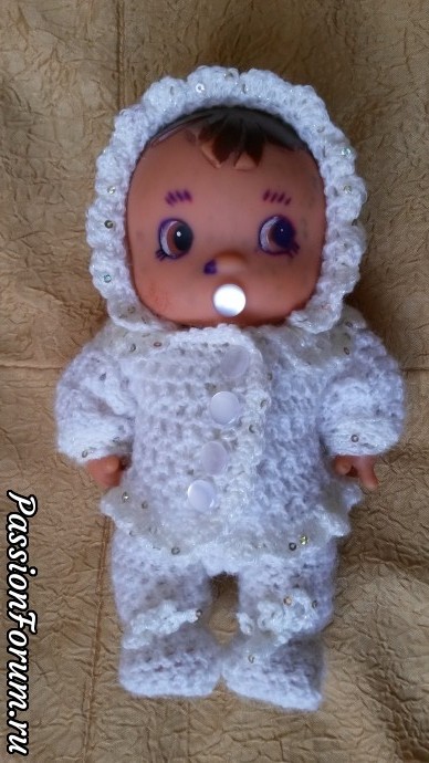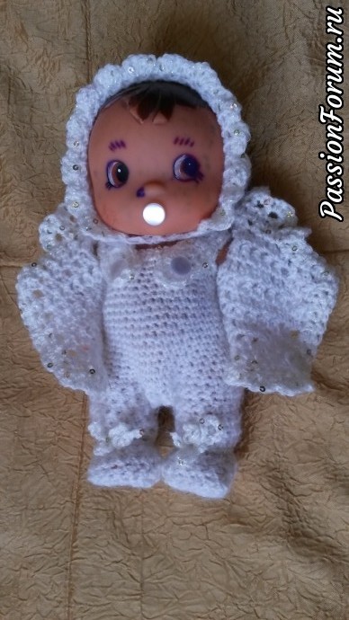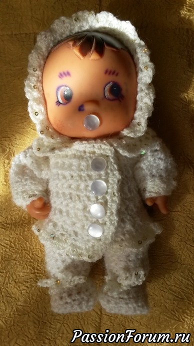 Делала мне в санатории массаж Ирина - добрейший и общительный человек и профессиональная массажистка. И мы с ней в течение всего сеанса разговаривали по душам. Я рассказывала какими видами творчества увлекаюсь. И вдруг Ира спрашивает: "А вы кукол не одеваете?" Было такое дело - говорю- вязала для кукол. Привезла она мне пупса. Пупс очень качественный, но замученный жизнью) У Иры трое детей, и поиграли они с пупсом на славу) А пупс дорог как память) Крючок и пряжа у меня с собой были, вот и обвязала я пупса Никитку с головы до ног.