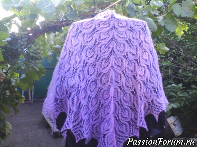 Шаль ,,Гейл''. Вот такая шалька связалась у меня во время перерывов между работой на дачке.Треугольная шаль королевских размеров цветочно-лиственного узора с ввязаными перламутровыми бусинками белого цвета .Шаль связана из пряжи ,,Ализе'' кид-мохнер нежно сиреневого цвета. Размер шали по центральной петле 106см, по внутренней дуге 210см, по кайме 340см .Вес шали 70г. Несмотря на свои внушительные размеры, шаль очень нежная и невесомая.