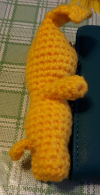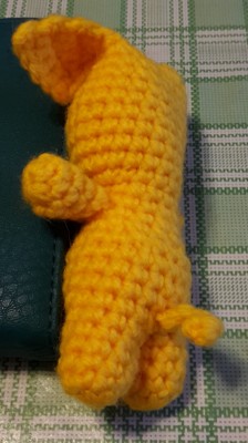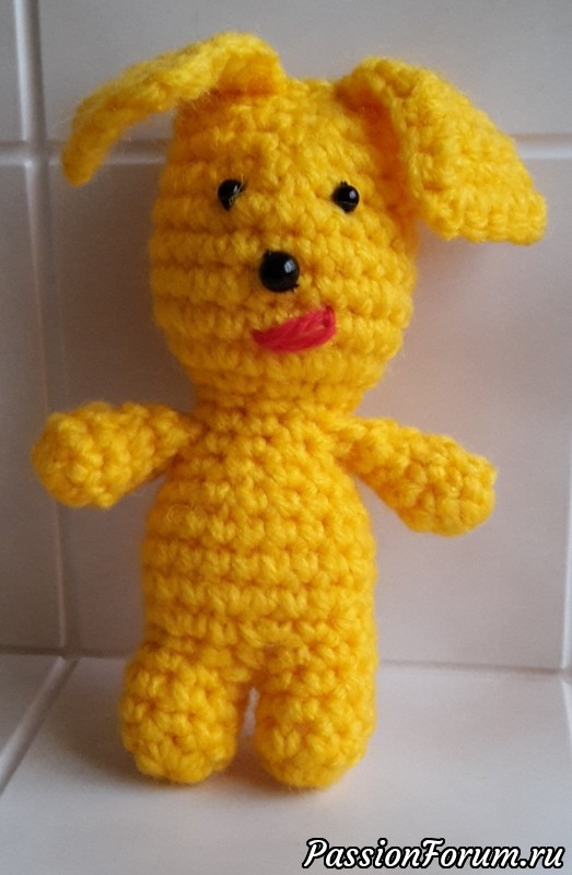 Провязываем дополнительные СБН до тех пор, чтобы, если повернуть собачку к себе лицом, нить оказалась справа сбоку (количество дополнительных СБН будет зависеть от того, в каком месте вы связали ножки; на результат это никак не влияет).