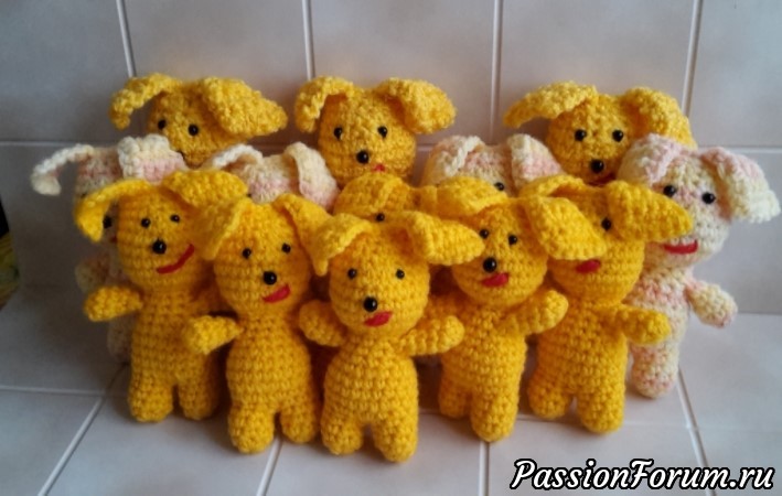 Стала придумывать свой вариант. Опять все не то - как у того горе-волшебника: сделать хотел грозу, а получил козу! Правда-правда! Вроде, вязала собаку. Показываю мужу и ребенку, спрашиваю: “Это кто?” Ответы были самые разные: то овечка, то ослик. Но собаку - не признали ни разу! Так прошли несколько бесплодных попыток, и вдруг! Озарение! Придумалось и, как мне кажется, получилось (по крайней мере, теперь домочадцы не сомневаются, что это собаки)!